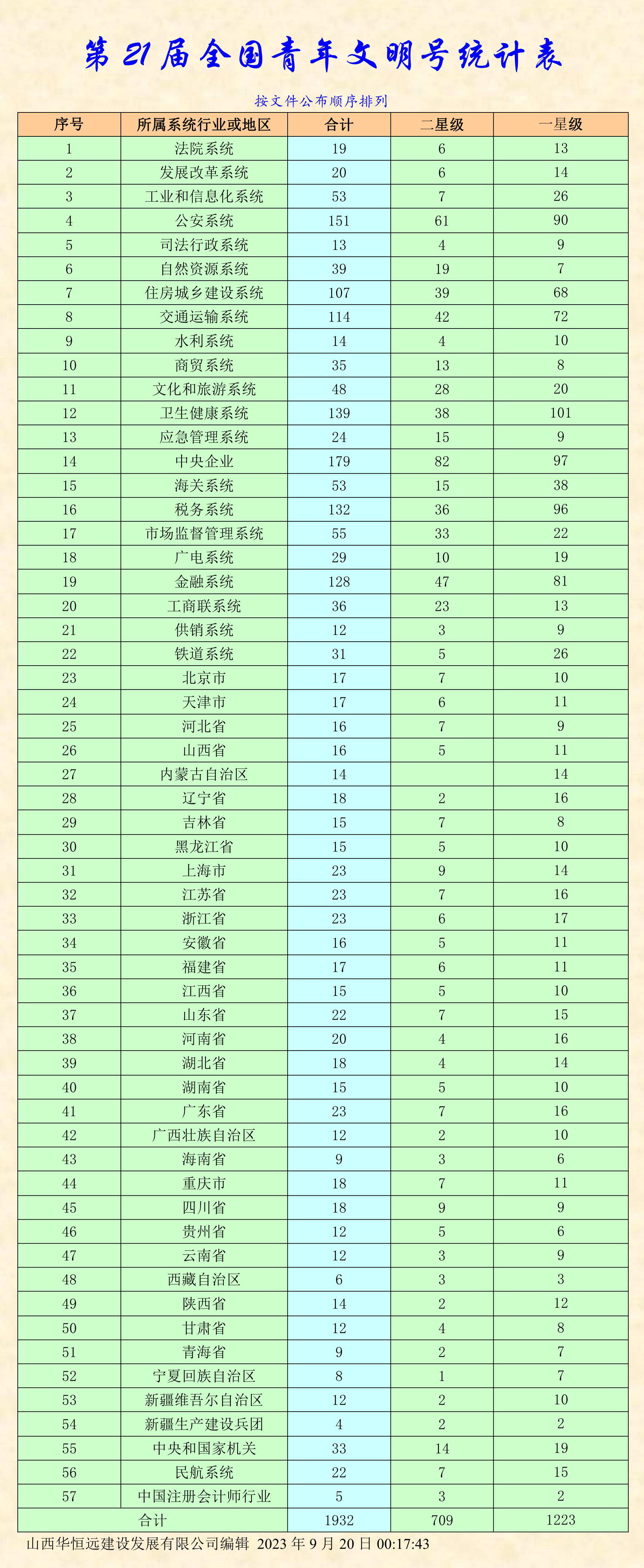 本報訊(中青報·中青網(wǎng)記者 李川)近日,共青團中央、最高人民法院、國家發(fā)展改革委、工業(yè)和信息化部、公安部、司法部、自然資源部、住房城鄉(xiāng)建設部、交通運輸部、水利部、商務部、文化和旅游部、國家衛(wèi)生健康委、應急管理部、國務院國資委、海關總署、稅務總局、市場監(jiān)管總局、廣電總局、金融監(jiān)管總局、全國工商聯(lián)、全國供銷合作總社、國鐵集團等23家全國創(chuàng)建青年文明號活動組委會成員單位聯(lián)合印發(fā)《關于命名第21屆全國青年文明號并進行星級認定的決定》,命名北京市順義區(qū)人民法院刑事審判庭等1932個集體為“第21屆全國青年文明號”;其中,認定浙江省杭州市余杭區(qū)人民法院執(zhí)行局等709個集體為首批“二星級全國青年文明號”,認定北京市順義區(qū)人民法院刑事審判庭等1223個集體為“一星級全國青年文明號”。