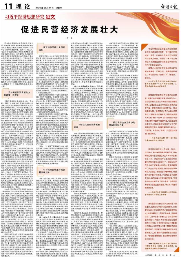 民營經(jīng)濟是社會主義市場經(jīng)濟發(fā)展的重要成果,是推動社會主義市場經(jīng)濟發(fā)展的重要力量。黨的十八大以來,以習(xí)近平同志為核心的黨中央對民營經(jīng)濟發(fā)展和民營企業(yè)家成長給予高度重視,強調(diào)“我國民營經(jīng)濟只能壯大、不能弱化,不僅不能‘離場’,而且要走向更加廣闊的舞臺”。黨的二十大報告鮮明提出“促進民營經(jīng)濟發(fā)展壯大”,這是長久之策,不是權(quán)宜之計。