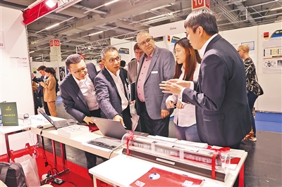 紐倫堡國際發(fā)明展中國展臺前,外國參觀者聽取中方工作人員介紹發(fā)明項目情況。 |