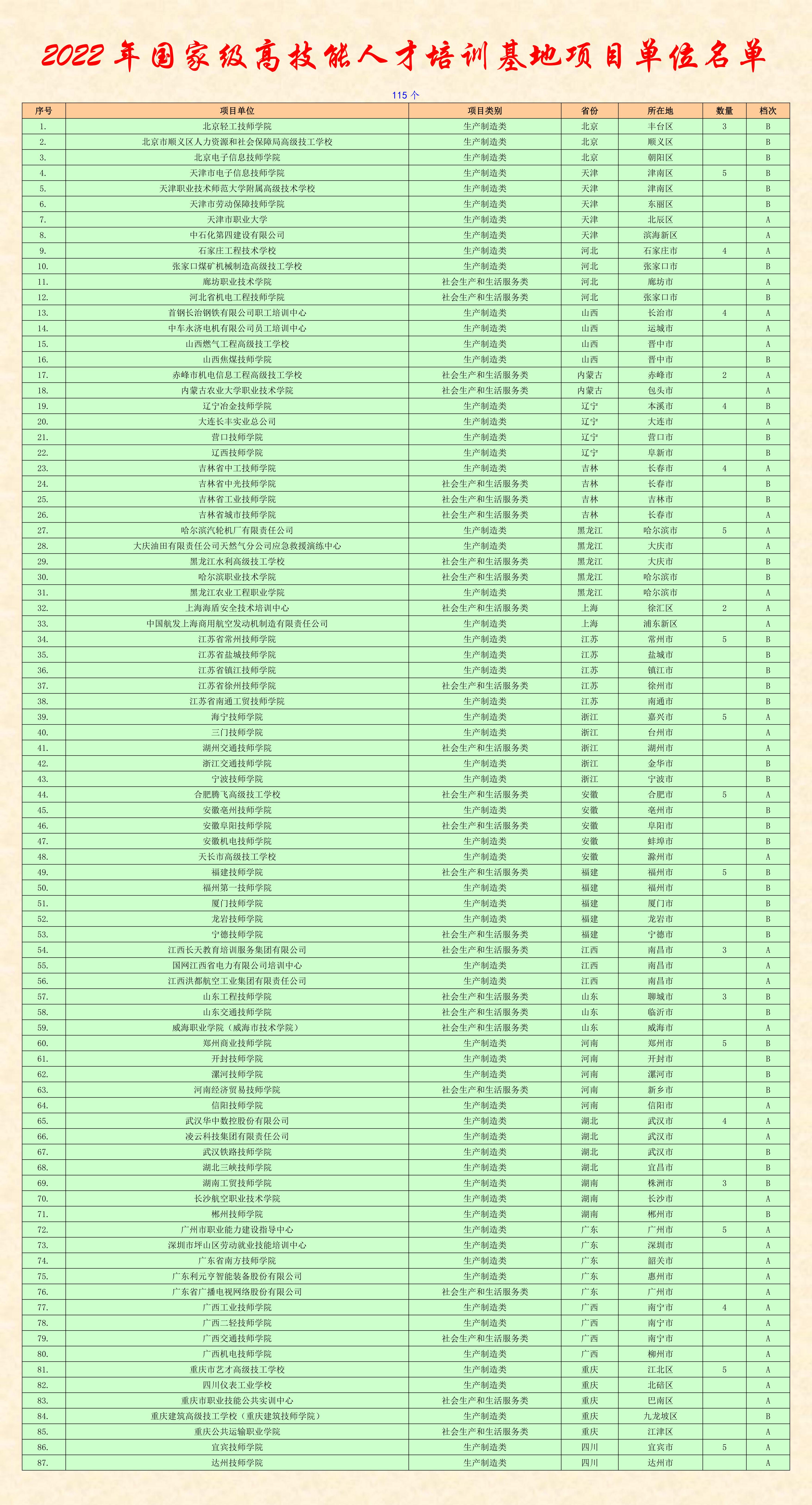 財(cái)政部辦公廳關(guān)于做好國(guó)家級(jí)高技能人才培訓(xùn)基地和技能大師工作室建設(shè)項(xiàng)目有關(guān)工作的通知》(以下簡(jiǎn)稱《通知》)要求,各省級(jí)人力資源社會(huì)保障、財(cái)政部門(mén)認(rèn)真組織開(kāi)展2022年國(guó)家級(jí)高技能人才培訓(xùn)基地和技能大師工作室項(xiàng)目申報(bào)、評(píng)審和公示,按要求報(bào)送備案材料。經(jīng)人力資源社會(huì)保障部和財(cái)政部對(duì)備案材料復(fù)核,確定北京輕工技師學(xué)院等115家單位為2022年國(guó)家級(jí)高技能人才培訓(xùn)基地項(xiàng)目單位(以下簡(jiǎn)稱基地),梁自旺技能大師工作室等139個(gè)項(xiàng)目所在單位為2022年國(guó)家級(jí)技能大師工作室項(xiàng)目單位(以下簡(jiǎn)稱工作室),現(xiàn)將基地和工作室項(xiàng)目單位及對(duì)應(yīng)的類(lèi)別和檔次予以備案公布。