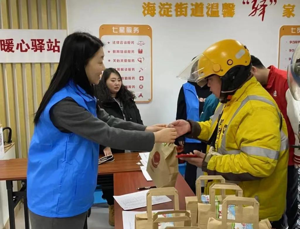 在北京市海淀區(qū)海淀街道,“溫馨驛家”13日開展了“小哥加油站,活力‘心’早餐”愛心活動,街道志愿者們將早餐提前打包好,發(fā)放愛心早餐50余份?!耙辉缑ζ饋頉]時間吃飯,沒想到在這還能吃到早餐,喝到熱騰騰的咖啡,特別感動。”一位外賣小哥說。