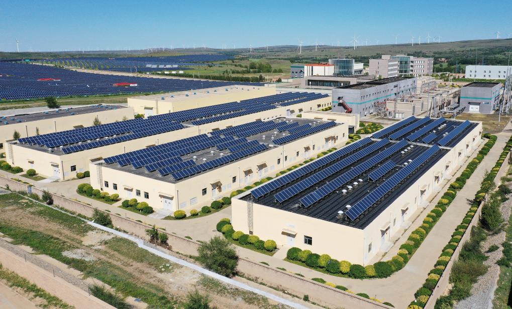 在河北張家口,國家風(fēng)光儲輸示范工程內(nèi)數(shù)排儲能廠房并列其中。(2023年8月18日攝,無人機照片)。新華社記者李賀 攝