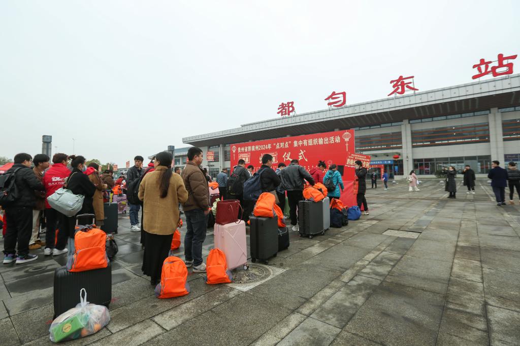 2月17日,來自貴州省黔南布依族苗族自治州各縣市的返崗務工人員在都勻東站廣場等待進站,準備乘坐返崗務工專列。新華社發(fā)(肖偉 攝)