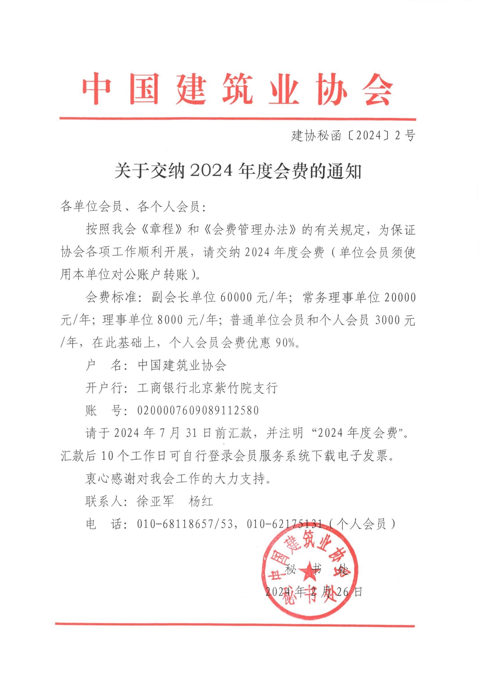 中國(guó)建筑業(yè)協(xié)會(huì)關(guān)于交納2024年度會(huì)費(fèi)的通知