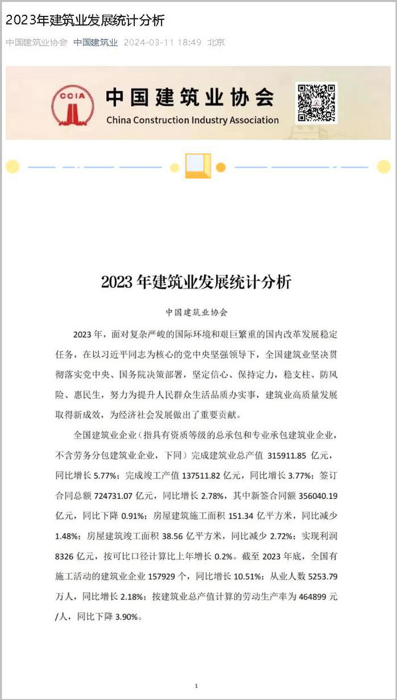 近日,中國建筑業(yè)協(xié)會發(fā)布了《2023年建筑業(yè)發(fā)展統(tǒng)計(jì)分析》。 截至2023年底,全國建筑業(yè)企業(yè) (指具有資質(zhì)等級的總承包和專業(yè)承包建筑業(yè)企業(yè),不含勞務(wù)分包建筑業(yè)企業(yè),下同) 相關(guān)數(shù)據(jù)如下: