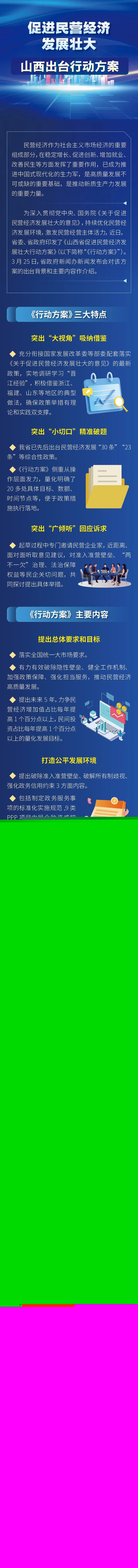 近年來,省委、省政府堅定落實黨中央決策部署,自覺把“促進民營經濟發(fā)展壯大”作為推動高質量發(fā)展、深化全方位轉型的重要抓手。我省已先后出臺民營經濟發(fā)展“30條” “23條”等綜合性政策,此次印發(fā)的《行動方案》不僅積極借鑒浙江、福建、山東等地區(qū)的典型做法,確保政策舉措有理論和實踐雙支撐,而且側重從操作層面發(fā)力,量化明確了20多處具體目標、數額、時間節(jié)點等,便于政策措施執(zhí)行落地。同時,邀請民營企業(yè)家,近距離、面對面聽取意見建議,共同探討提出具體舉措。可以說,《行動方案》是我省“十四五”期間大力促進民營經濟發(fā)展壯大的施工藍圖。