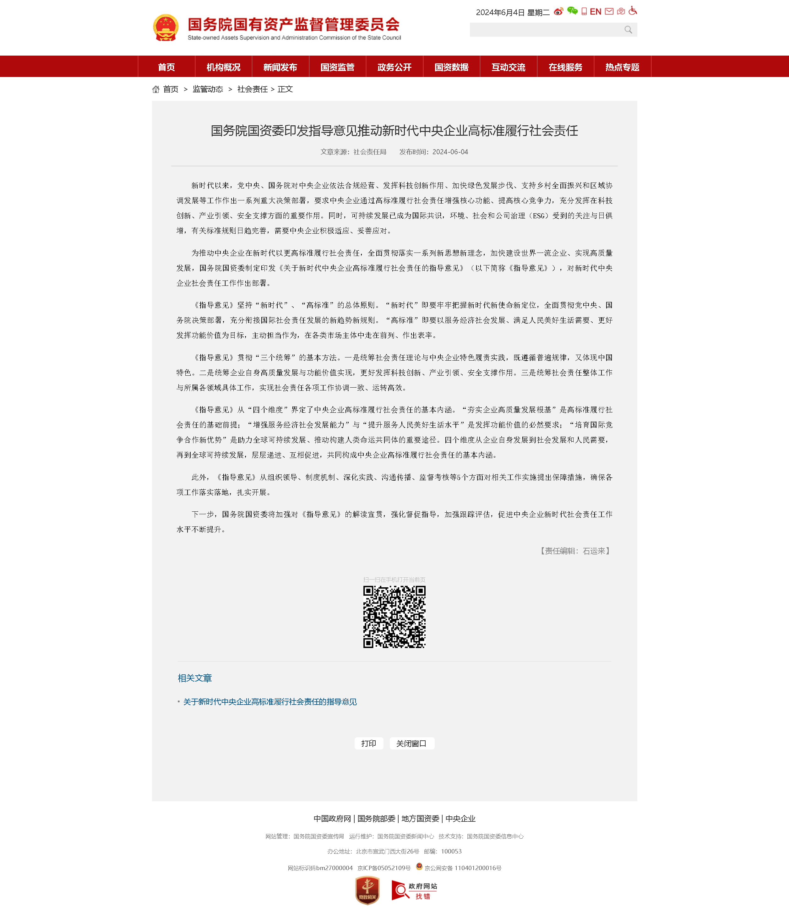 (十二)切實加強環(huán)境、社會和公司治理(ESG)工作。將ESG工作納入社會責任工作統(tǒng)籌管理,積極把握、應(yīng)對ESG發(fā)展帶來的機遇和挑戰(zhàn)。推動控股上市公司圍繞ESG議題高標準落實環(huán)境管理要求、積極履行社會責任、健全完善公司治理,加強高水平ESG信息披露,不斷提高ESG治理能力和績效水平,增強在資本市場的價值認同。推動海外經(jīng)營機構(gòu)在海外經(jīng)營管理、重大項目實施中將ESG工作作為重要內(nèi)容,主動適應(yīng)所在國家、地區(qū)ESG規(guī)范要求,強化ESG治理、實踐和信息披露,持續(xù)提升國際市場競爭力。