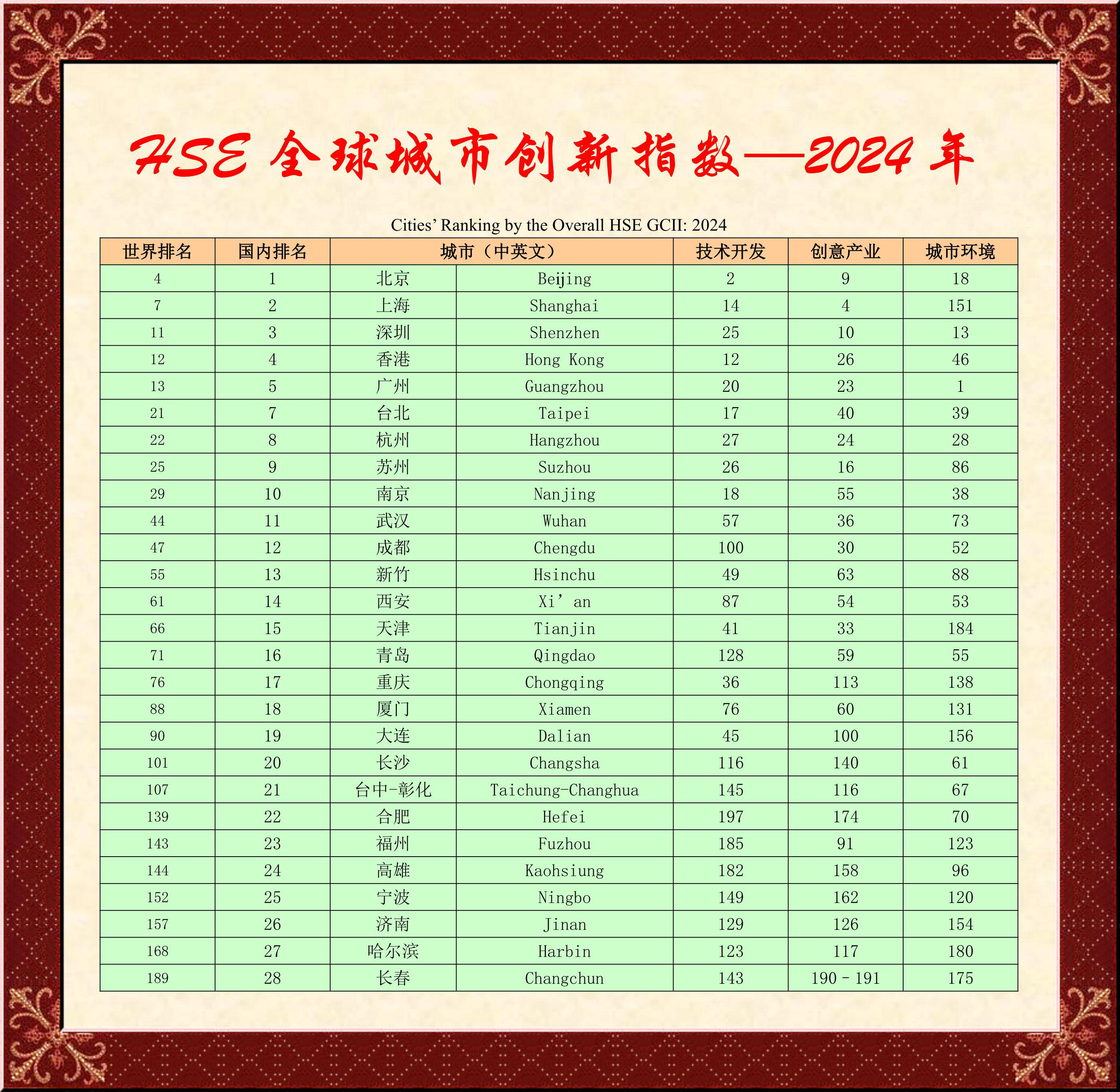排名 城市(中英文) 技術(shù)開發(fā) 創(chuàng)意產(chǎn)業(yè) 城市環(huán)境