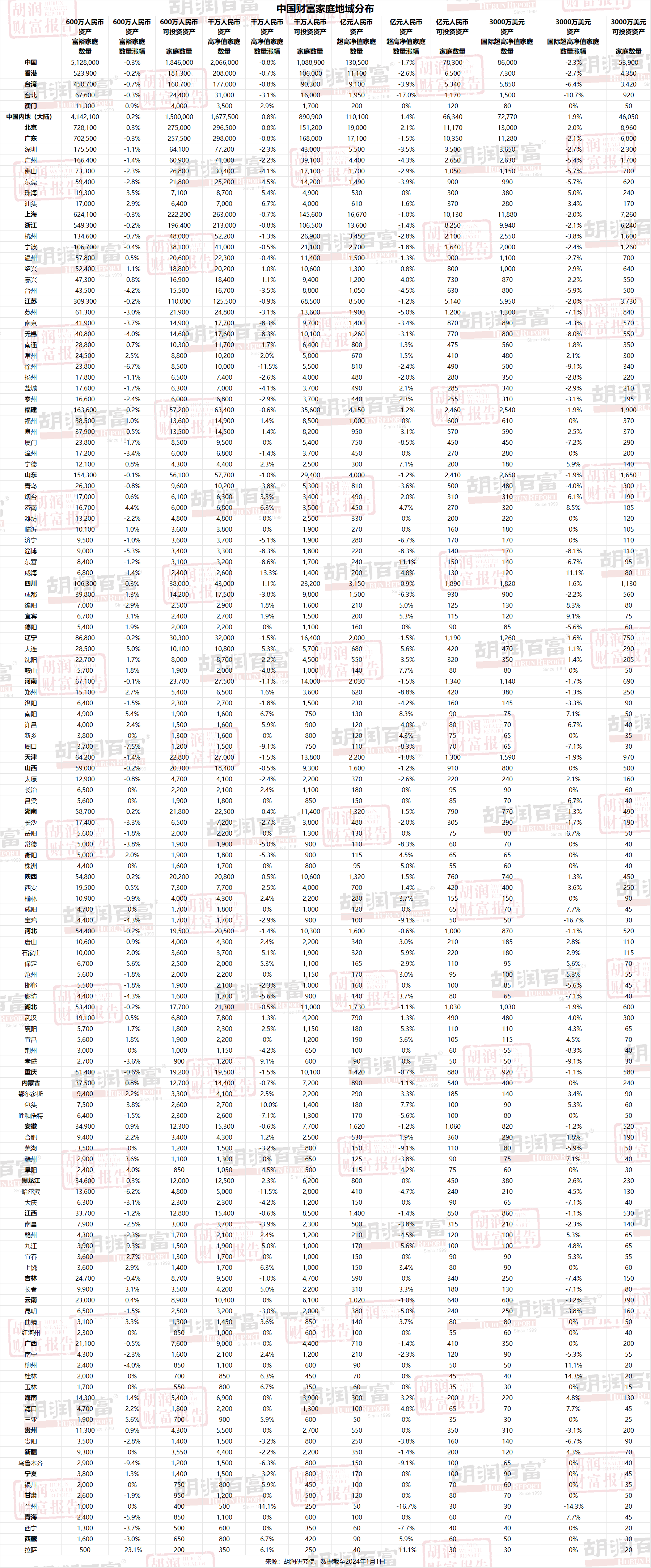 截至2024年1月1日,中國富裕家庭(資產(chǎn)600萬以上)數(shù)量微降至512.8萬戶,同比減少0.3%,即減少了1.4萬戶,其中,擁有600萬可投資資產(chǎn)的家庭為184.6萬戶。高凈值家庭(資產(chǎn)千萬以上)數(shù)量為206.6萬戶,同比減少0.8%,減少了1.7萬戶,其中擁有千萬可投資資產(chǎn)的家庭為108.9萬戶。超高凈值家庭(資產(chǎn)億元以上)數(shù)量為13萬戶,同比減少1.7%,減少了2,200戶,其中擁有億元可投資資產(chǎn)的家庭為7.8萬戶。國際超高凈值家庭(資產(chǎn)3000萬美元以上)數(shù)量為8.6萬戶,同比減少2.3%,減少了2,000戶,其中擁有3000萬美元可投資資產(chǎn)的家庭為5.4萬戶。
