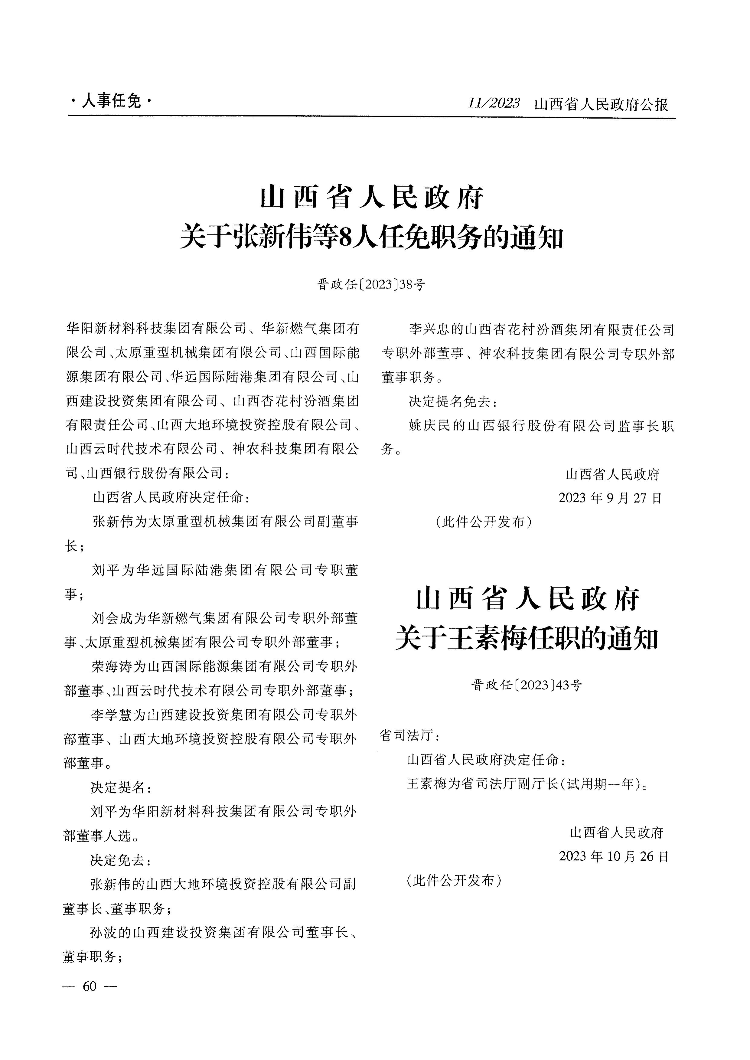 劉會成為華新燃氣集團有限公司專職外部董事、太原重型機械集團有限公司專職外部董事;