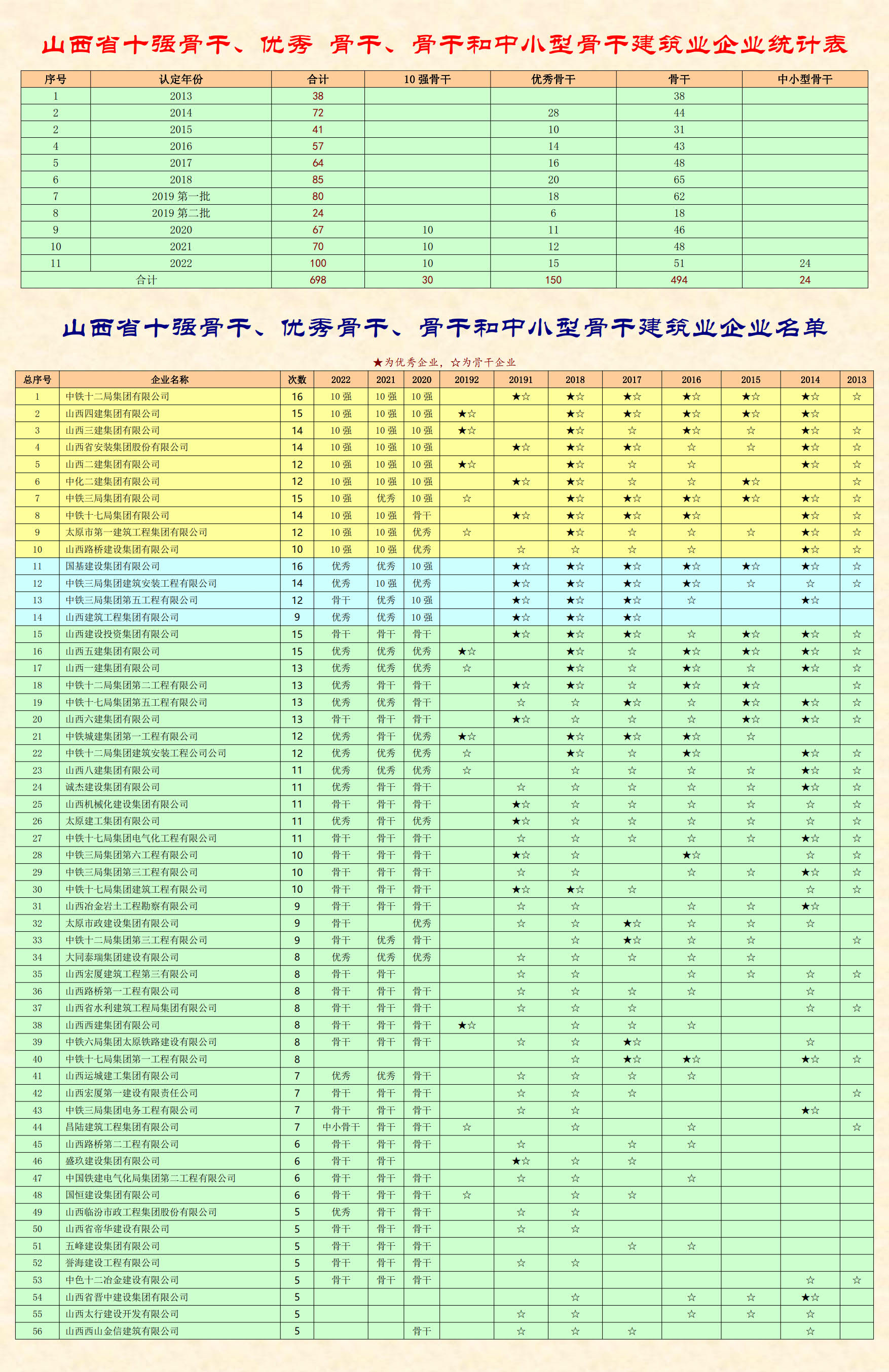 歷年山西省骨干、優(yōu)秀骨干 和10強(qiáng)骨干建筑業(yè)企業(yè)名單及統(tǒng)計(jì)表