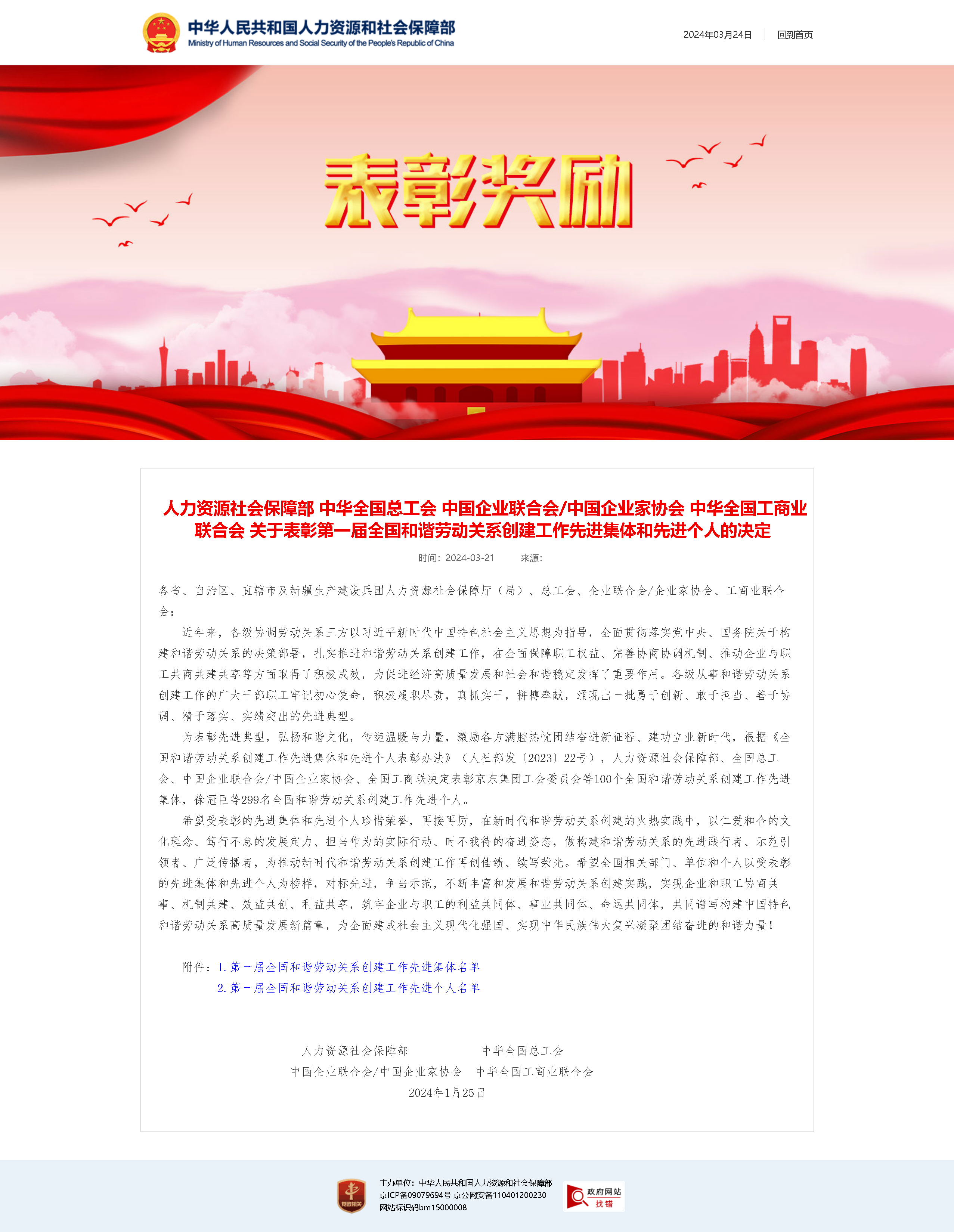 為表彰先進(jìn)典型,弘揚(yáng)和諧文化,傳遞溫暖與力量,激勵(lì)各方滿腔熱忱團(tuán)結(jié)奮進(jìn)新征程、建功立業(yè)新時(shí)代,根據(jù)《全國和諧勞動關(guān)系創(chuàng)建工作先進(jìn)集體和先進(jìn)個(gè)人表彰辦法》(人社部發(fā)〔2023〕22號),人力資源社會保障部、全國總工會、中國企業(yè)聯(lián)合會/中國企業(yè)家協(xié)會、全國工商聯(lián)決定表彰京東集團(tuán)工會委員會等100個(gè)全國和諧勞動關(guān)系創(chuàng)建工作先進(jìn)集體,徐冠巨等299名全國和諧勞動關(guān)系創(chuàng)建工作先進(jìn)個(gè)人。