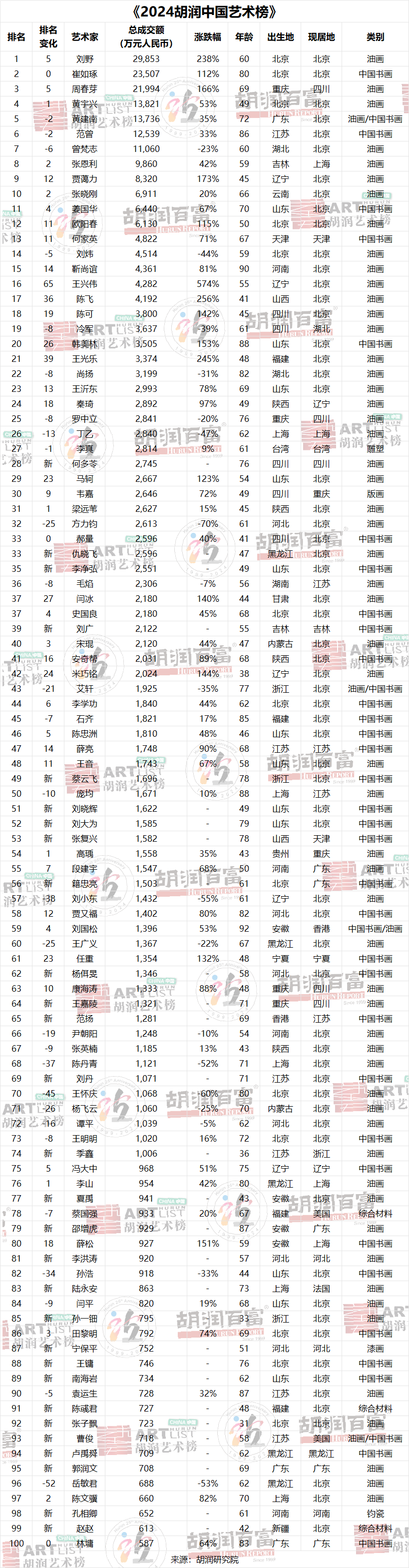【行業(yè)資料】2013-2024胡潤中國藝術(shù)榜