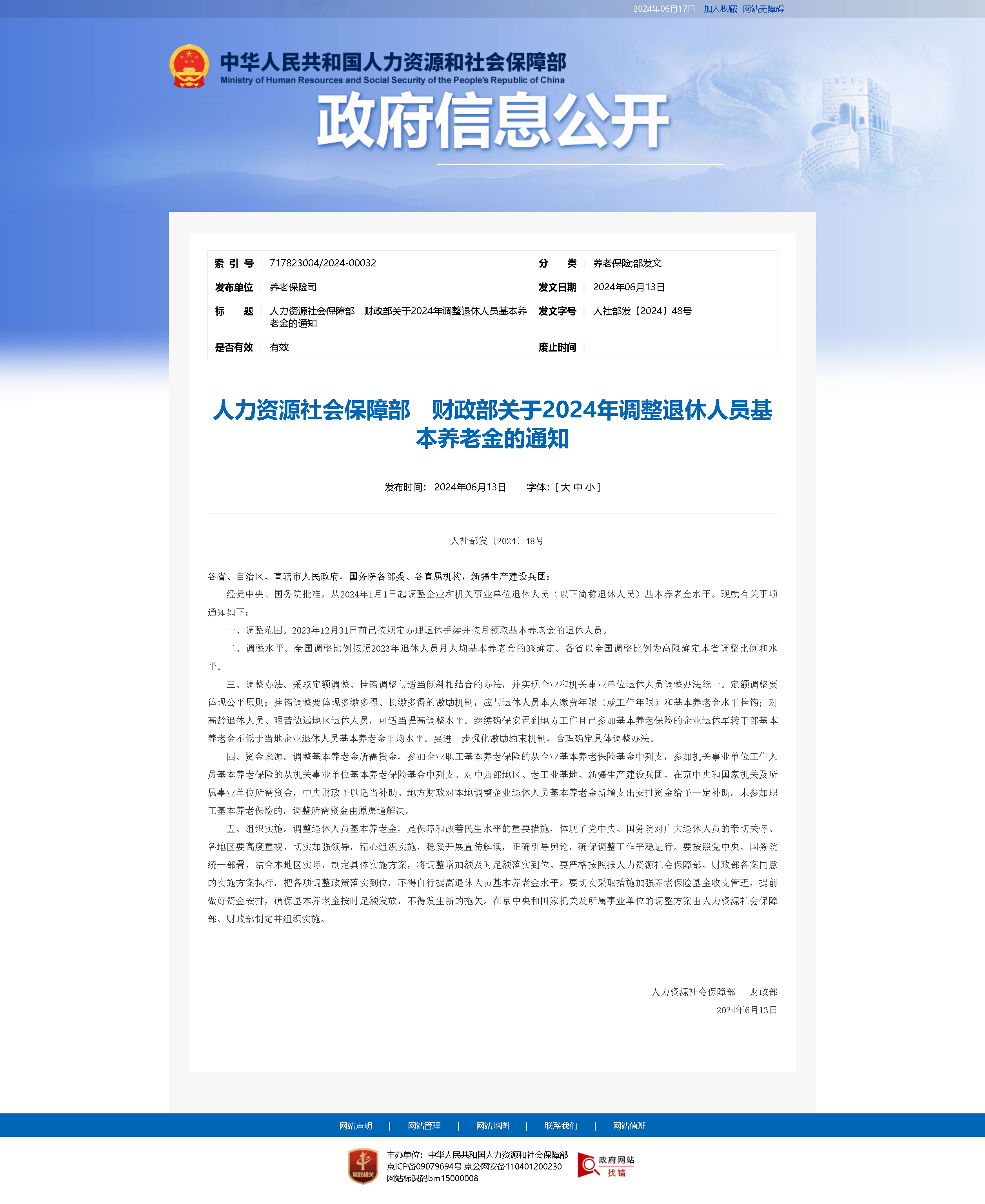 人力資源社會保障部 財政部關于2023年調(diào)整退休人員基本養(yǎng)老金的通知