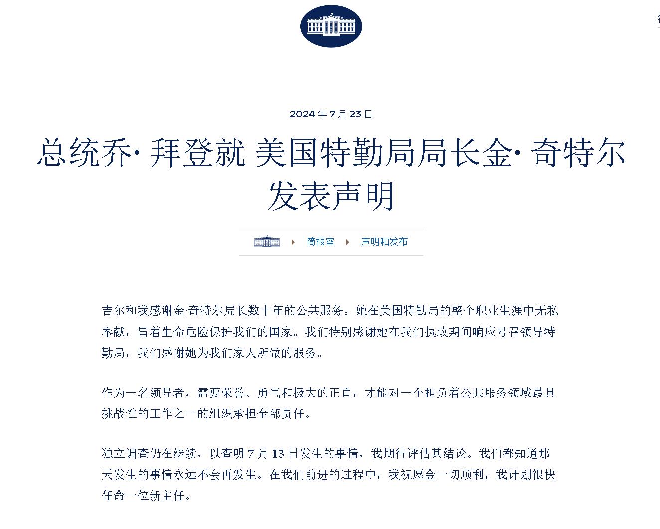 美國總統(tǒng)拜登23日發(fā)表聲明,感謝奇特爾在職期間為國家作出的貢獻(xiàn),并表示“未遂刺殺”事件獨(dú)立審查工作仍在繼續(xù),他將很快任命新的特勤局局長。美國國土安全部長馬約卡斯隨后在一份聲明中宣布,特勤局副局長羅納德·羅已被任命為特勤局代理局長。