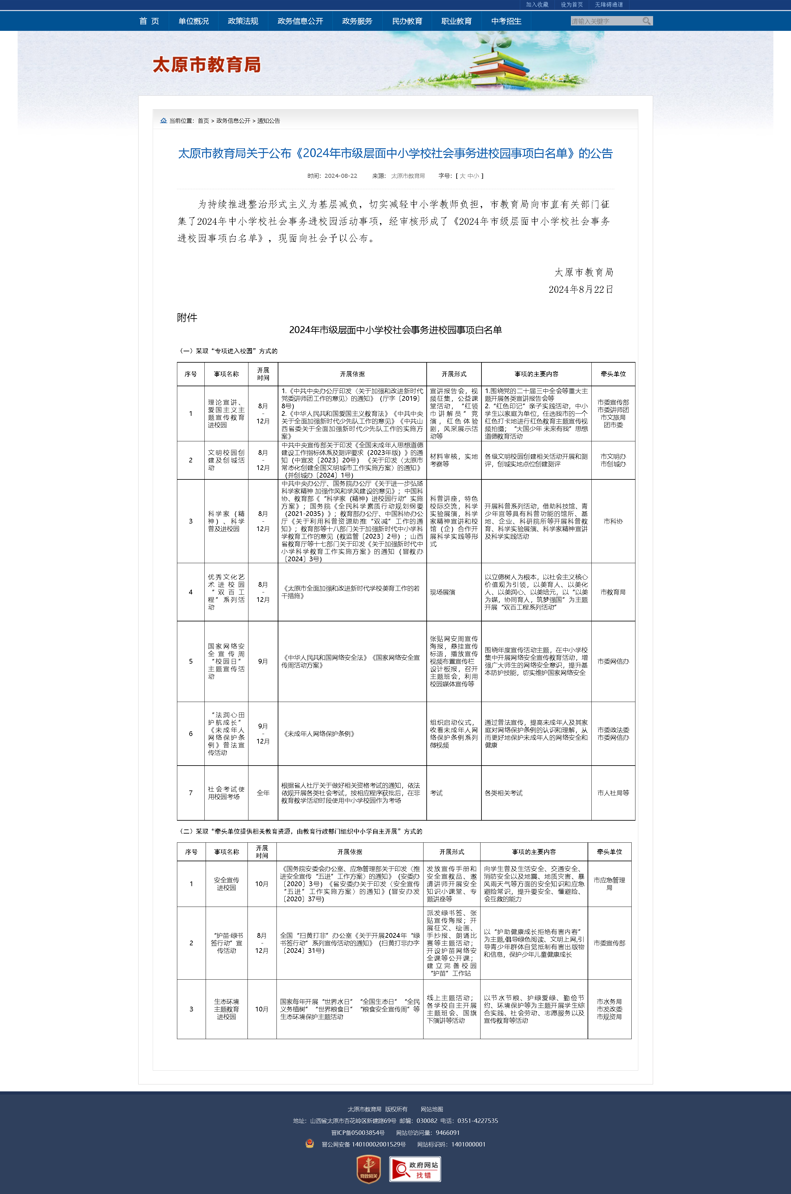 近日,記者從太原市教育局獲悉,為持續(xù)推進(jìn)整治形式主義為基層減負(fù),切實(shí)減輕中小學(xué)教師負(fù)擔(dān),太原市教育局向市直有關(guān)部門征集了2024年中小學(xué)校社會(huì)事務(wù)進(jìn)校園活動(dòng)事項(xiàng),經(jīng)審核形成了《2024年市級(jí)層面中小學(xué)校社會(huì)事務(wù)進(jìn)校園事項(xiàng)白名單》,現(xiàn)面向社會(huì)予以公布。