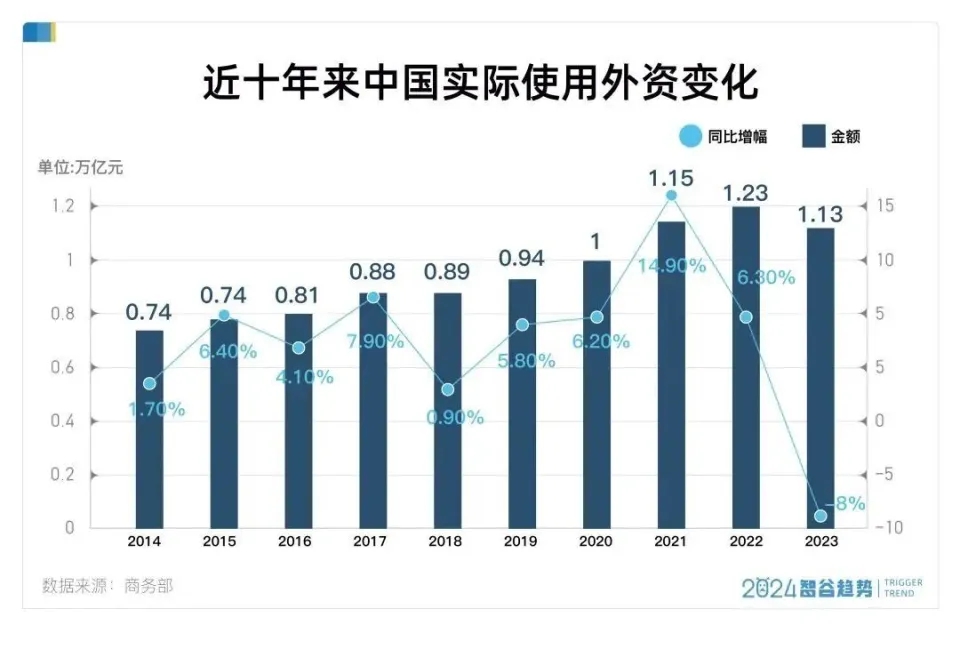 2023年,我國的外商投資出現(xiàn)了近十年來的首次下降,降幅約為8%。