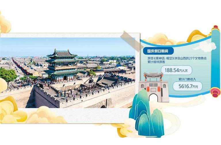 隨著游戲《黑神話:悟空》話題熱度持續(xù)上漲,山西作為游戲中取景地最多的省份,古建打卡熱度在國慶假期達到新高。國慶假日期間,游戲涉及山西的27個文物景點累計接待游客188.54萬人次,累計門票收入5616.7萬元。
