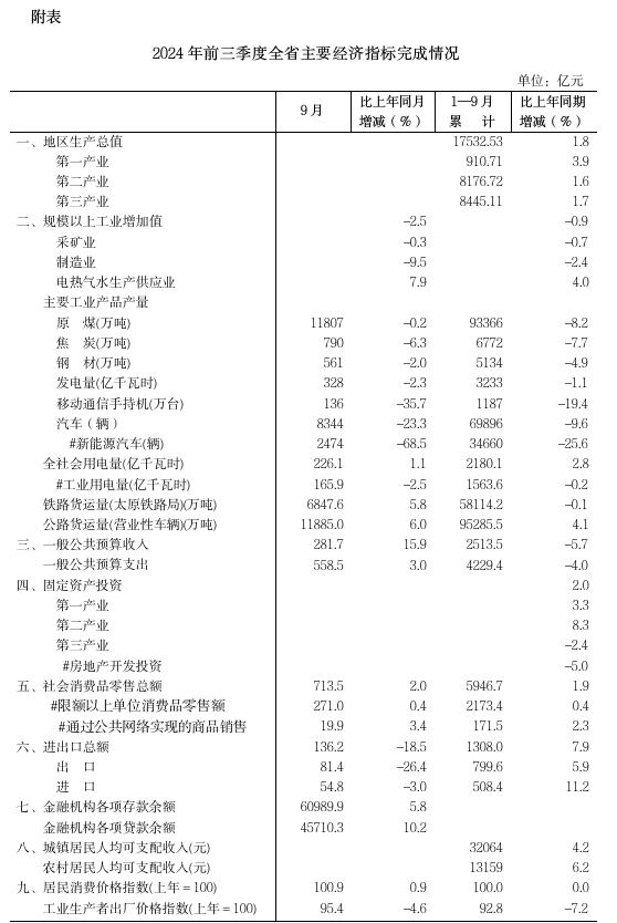 總的來看,前三季度全省經(jīng)濟運行保持穩(wěn)定恢復(fù)態(tài)勢。尤其是進入三季度以來,隨著一系列宏觀政策成效逐步顯現(xiàn),部分行業(yè)領(lǐng)域呈現(xiàn)積極變化,9月當(dāng)月,全省固定資產(chǎn)投資增速較8月份由負轉(zhuǎn)正回升4.9個百分點,一般公共預(yù)算收入由負轉(zhuǎn)正回升16.0個百分點,限額以上消費品零售額由負轉(zhuǎn)正回升1.9個百分點,其中家用電器和音像器材類零售額加快18.2個百分點。但外部環(huán)境復(fù)雜嚴(yán)峻,經(jīng)濟穩(wěn)增長基礎(chǔ)尚不牢固。下一步,全省上下要全面貫徹落實黨的二十屆三中全會精神,按照黨中央關(guān)于經(jīng)濟工作的決策部署,圍繞省委、省政府工作重點,堅定發(fā)展信心、積極主動作為,補足短板弱項、增強內(nèi)生動力,強化存量政策和增量政策協(xié)同發(fā)力,鞏固經(jīng)濟穩(wěn)定運行、回升向好基礎(chǔ),努力完成全年經(jīng)濟社會發(fā)展目標(biāo)任務(wù)。