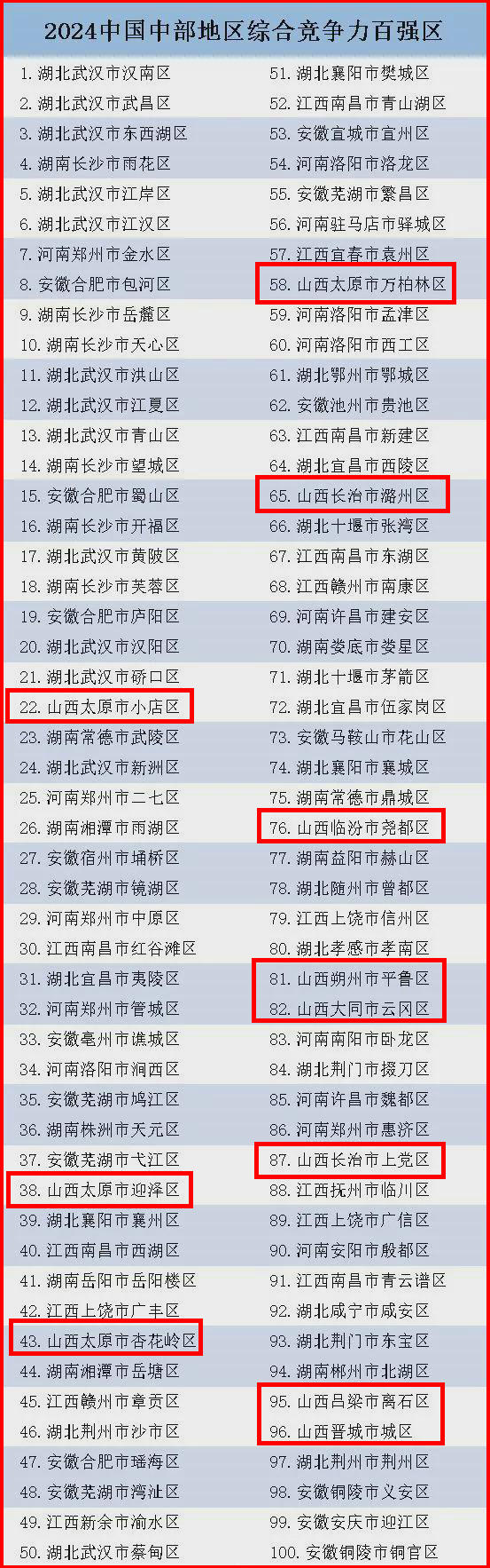 本報訊(記者丁園)日前,競爭力智庫、北京中新城市規(guī)劃設計研究院等機構(gòu)在京發(fā)布《中國縣域發(fā)展監(jiān)測報告2024》(以下簡稱《報告》)。其中,在2024中國中部地區(qū)綜合競爭力百強區(qū)榜單中,我省共有11個區(qū)上榜,太原市以4個區(qū)位居全省之首。