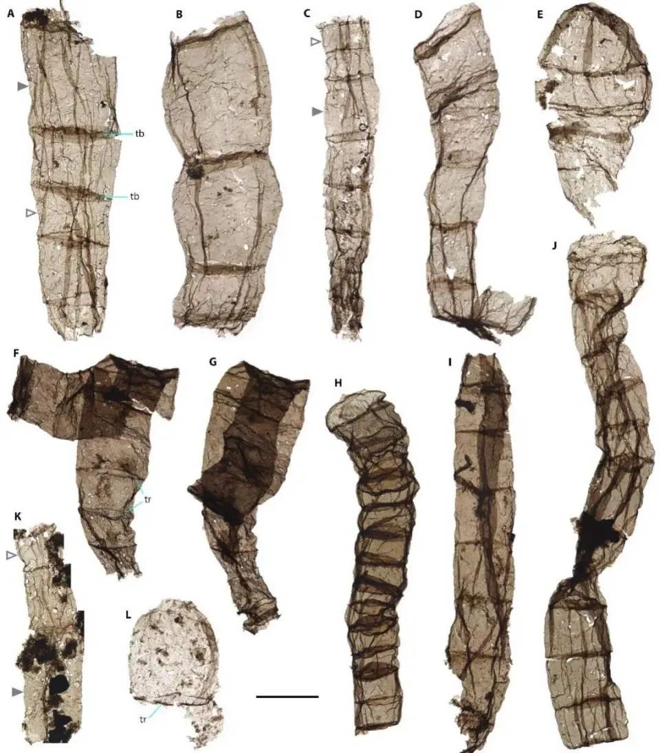 ▲串嶺溝組中發(fā)現(xiàn)的壯麗青山藻?;4鏋橛袡C(jī)質(zhì)壁構(gòu)成的多細(xì)胞絲狀體,顯示細(xì)胞大小和形態(tài)的變化引起的絲狀體形態(tài)變化。絲狀體直徑向一端收縮(A-D、F-I、K),絲狀體直徑不變(J),保存有完整端部的絲狀體(E、L)。比例尺對(duì)于F-H和K代表100微米,其余的代表50微米。