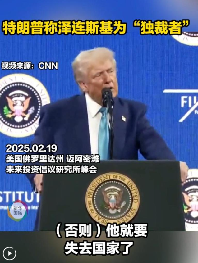 美國(guó)總統(tǒng)特朗普19日在佛羅里達(dá)州一場(chǎng)會(huì)議上說(shuō),烏克蘭總統(tǒng)澤連斯基是 “獨(dú)裁者”。他警告說(shuō),澤連斯基必須迅速采取行動(dòng)以實(shí)現(xiàn)和平,否則將面臨失去國(guó)家的風(fēng)險(xiǎn)。