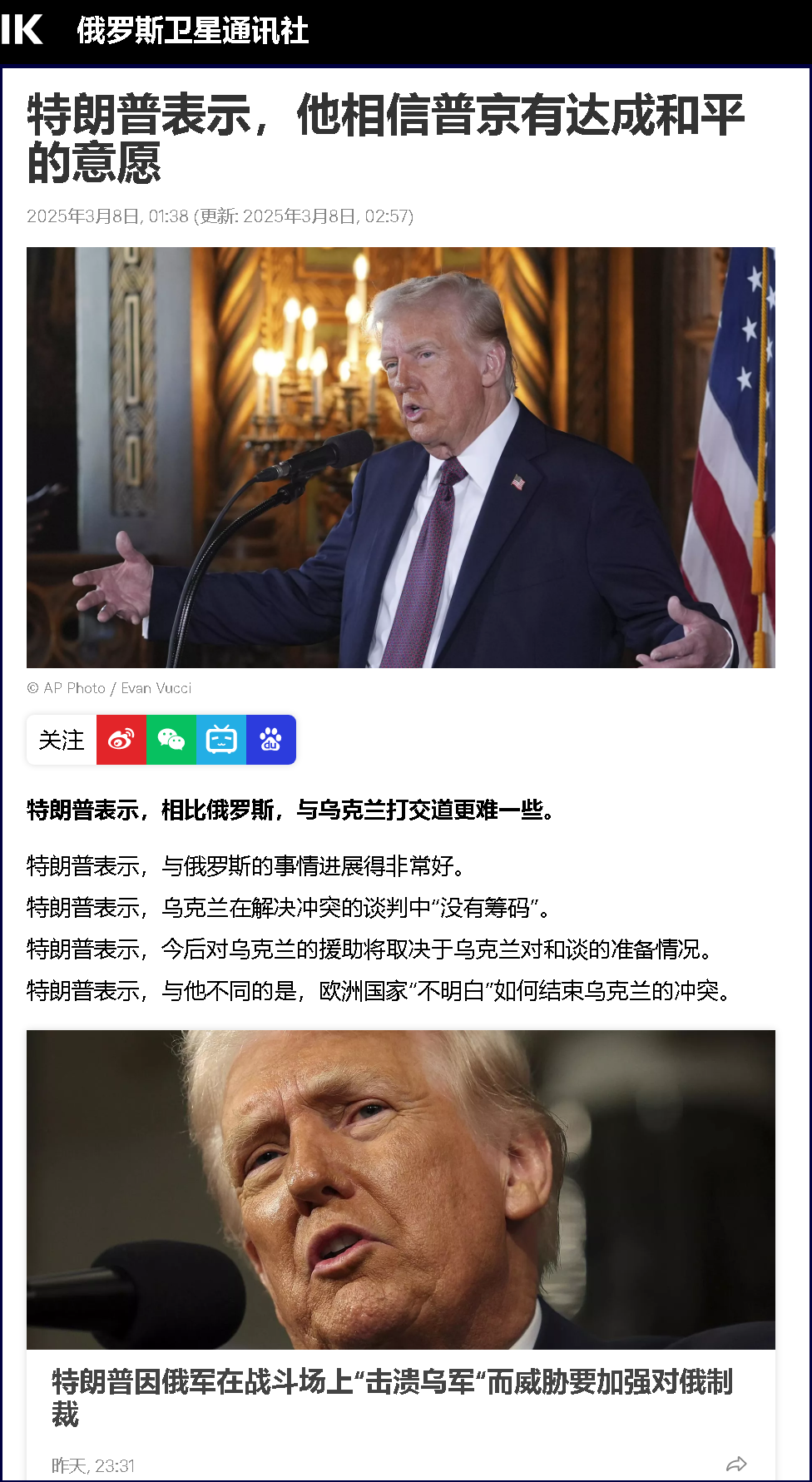 特朗普說,鑒于俄羅斯目前在戰(zhàn)場(chǎng)上“猛烈打擊”烏克蘭,他強(qiáng)烈考慮對(duì)俄實(shí)施包括針對(duì)銀行業(yè)在內(nèi)的大規(guī)模制裁以及加征關(guān)稅,以向其施壓達(dá)成停火和最終和平協(xié)議。特朗普還敦促俄羅斯和烏克蘭“坐到談判桌上”。