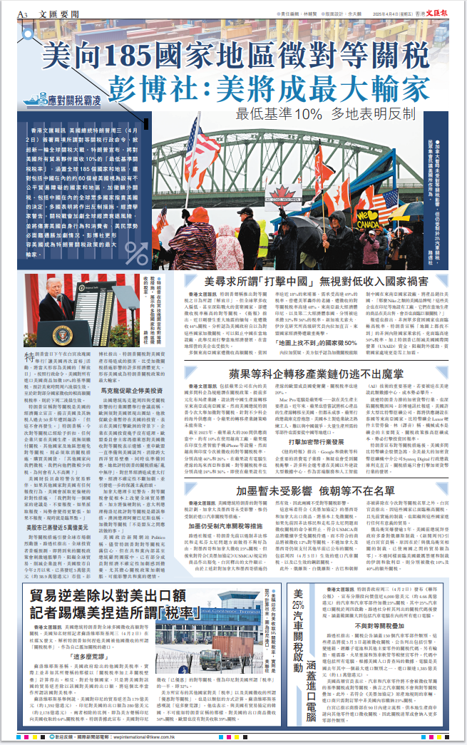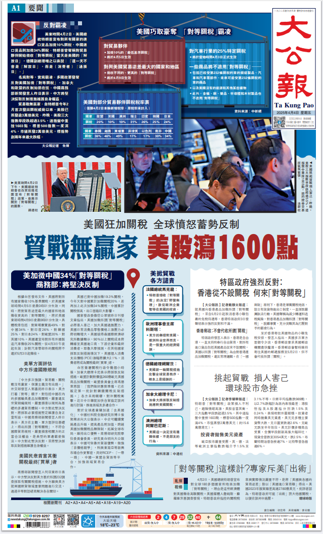 美國總統(tǒng)特朗普昨日發(fā)動史無前例的關(guān)稅戰(zhàn),向全世界主要國家徵收巨額關(guān)稅。此舉進一步暴露其霸權(quán)主義的真面目,遭到包括其盟友在內(nèi)所有國家的一致強烈反對。美股昨晚一度大跌1600點,足以體現(xiàn)市場的態(tài)度。面對美國的野蠻霸道行徑,中國將採取必要措施堅定維護自身權(quán)益。對香港特區(qū)來說,挑戰(zhàn)和機遇並存,既要正視美關(guān)稅戰(zhàn)帶來的衝擊,更要堅定發(fā)展信心,加快融入國家發(fā)展大局,加大開拓新市場的力度,提升應(yīng)對風(fēng)浪的能力。