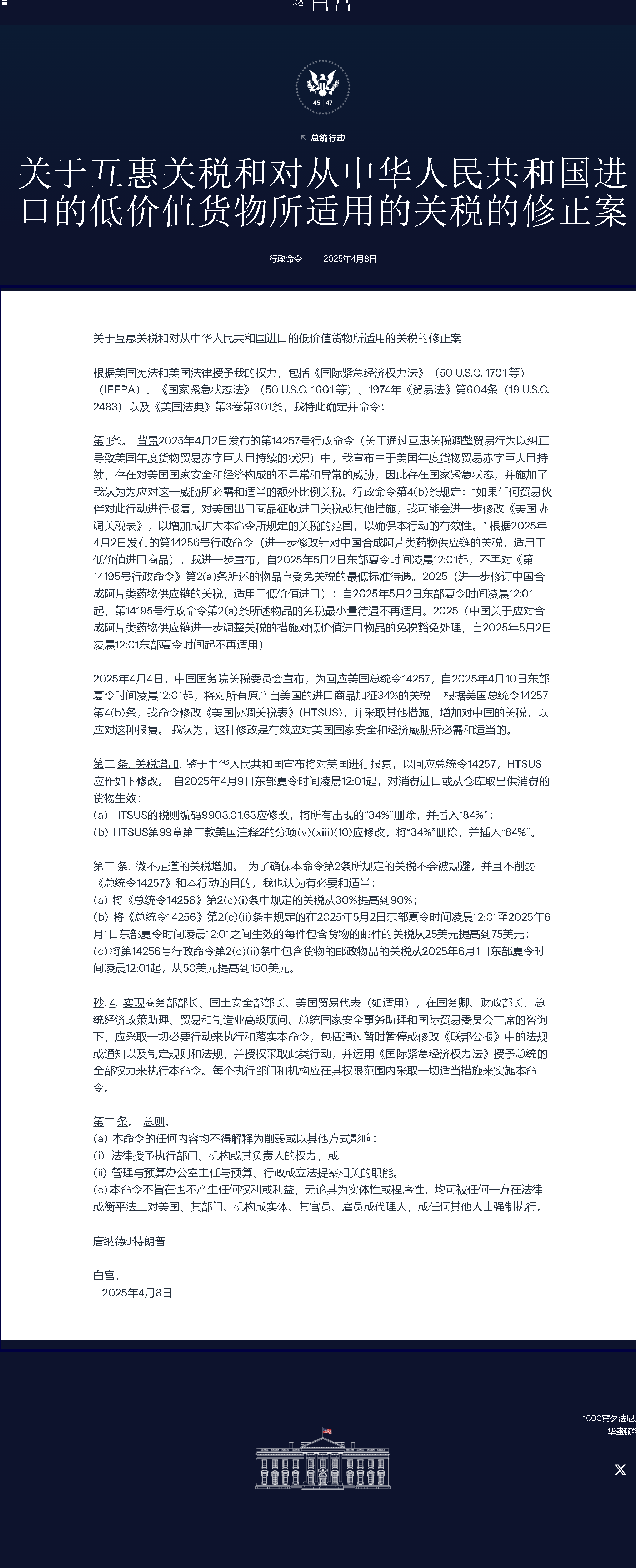 4月2日,特朗普表示將在其對(duì)等關(guān)稅行動(dòng)中對(duì)中國額外征收 34% 的關(guān)稅,使他第二任期內(nèi)對(duì)中國的關(guān)稅總額達(dá)到 54%,而在中國很快宣布對(duì)等反制措施后,特朗普于8日宣布在對(duì)等關(guān)稅生效時(shí)將對(duì)中國額外征收 50% 的關(guān)稅,并在美東時(shí)間4月9日凌晨12時(shí)01分(北京時(shí)間中午12時(shí)01分)正式生效,導(dǎo)致美國對(duì)中國的整體關(guān)稅稅率達(dá)到驚人的104%。