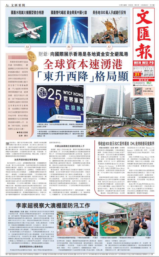陳茂波提到,國家和香港在全球變局中蘊藏不少新的投資機遇,也在許多創(chuàng)科領(lǐng)域中有領(lǐng)先的前沿發(fā)展。香港于上星期連續(xù)舉辦兩場不同主題的大型國際會議——「世界互聯(lián)網(wǎng)大會亞太峰會」和「2025世界旅游城市聯(lián)合會香港香山旅游峰會」,前者首次移師境外舉行,亦是本港首次舉辦國家級別的重要學(xué)術(shù)峰會;后者亦首次在港舉行,也彰顯香港作為國際旅游樞紐的重要地位。在兩個峰會上,許多與會者不約而同指出,十分看好國家和香港的發(fā)展前景。