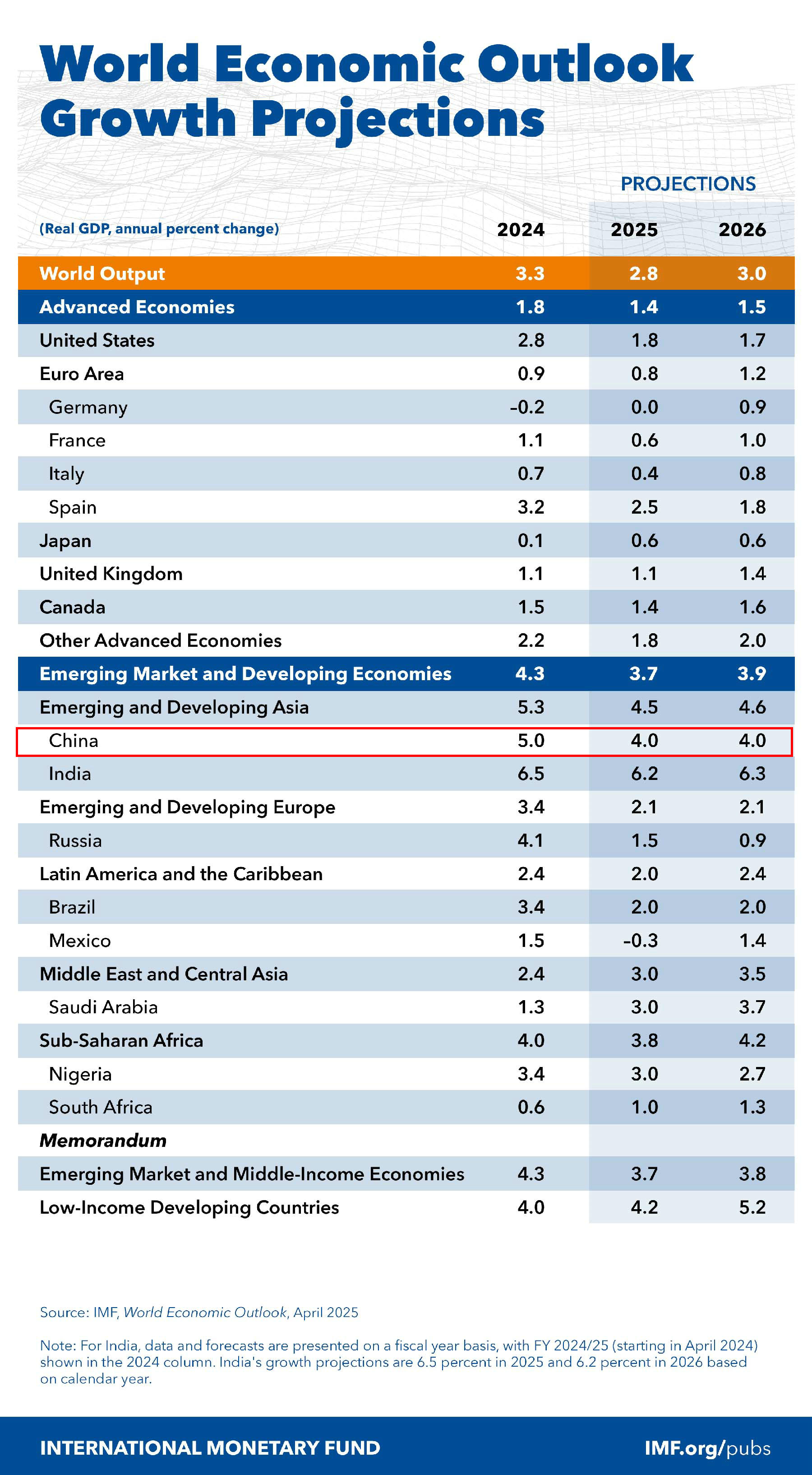 報告顯示,2025年發(fā)達經(jīng)濟體增速預(yù)計為1.4%,新興市場和發(fā)展中經(jīng)濟體增速為3.7%,均較1月預(yù)測值下調(diào)0.5個百分點。其中,美國經(jīng)濟增速將放緩至1.8%,較1月預(yù)測值低0.9個百分點,在發(fā)達經(jīng)濟體中下調(diào)幅度最大。政策不確定性加劇、貿(mào)易緊張局勢以及需求勢頭減弱是下調(diào)美國經(jīng)濟增長預(yù)期的主要原因。