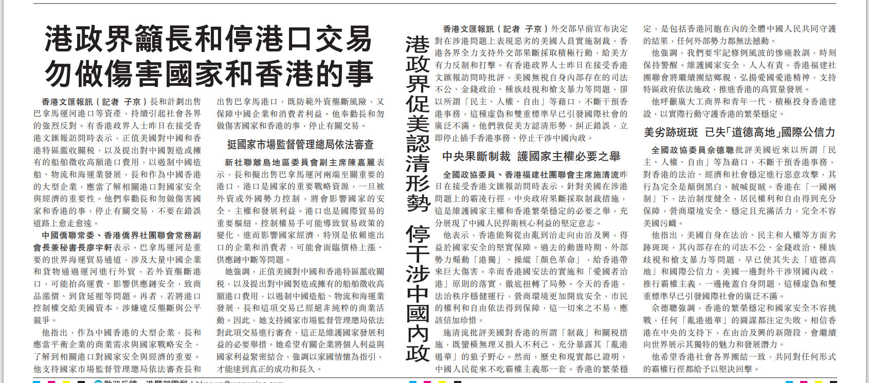 他指出,作為中國香港的大型企業(yè),長和應當平衡企業(yè)的商業(yè)需求與國家戰(zhàn)略安全,了解到相關港口對國家安全與經(jīng)濟的重要。他支持國家市場監(jiān)督管理總局依法審查長和出售巴拿馬港口,既防范外資壟斷風險,又保障中國企業(yè)和消費者利益。他奉勸長和勿做傷害國家和香港的事,停止有關交易。