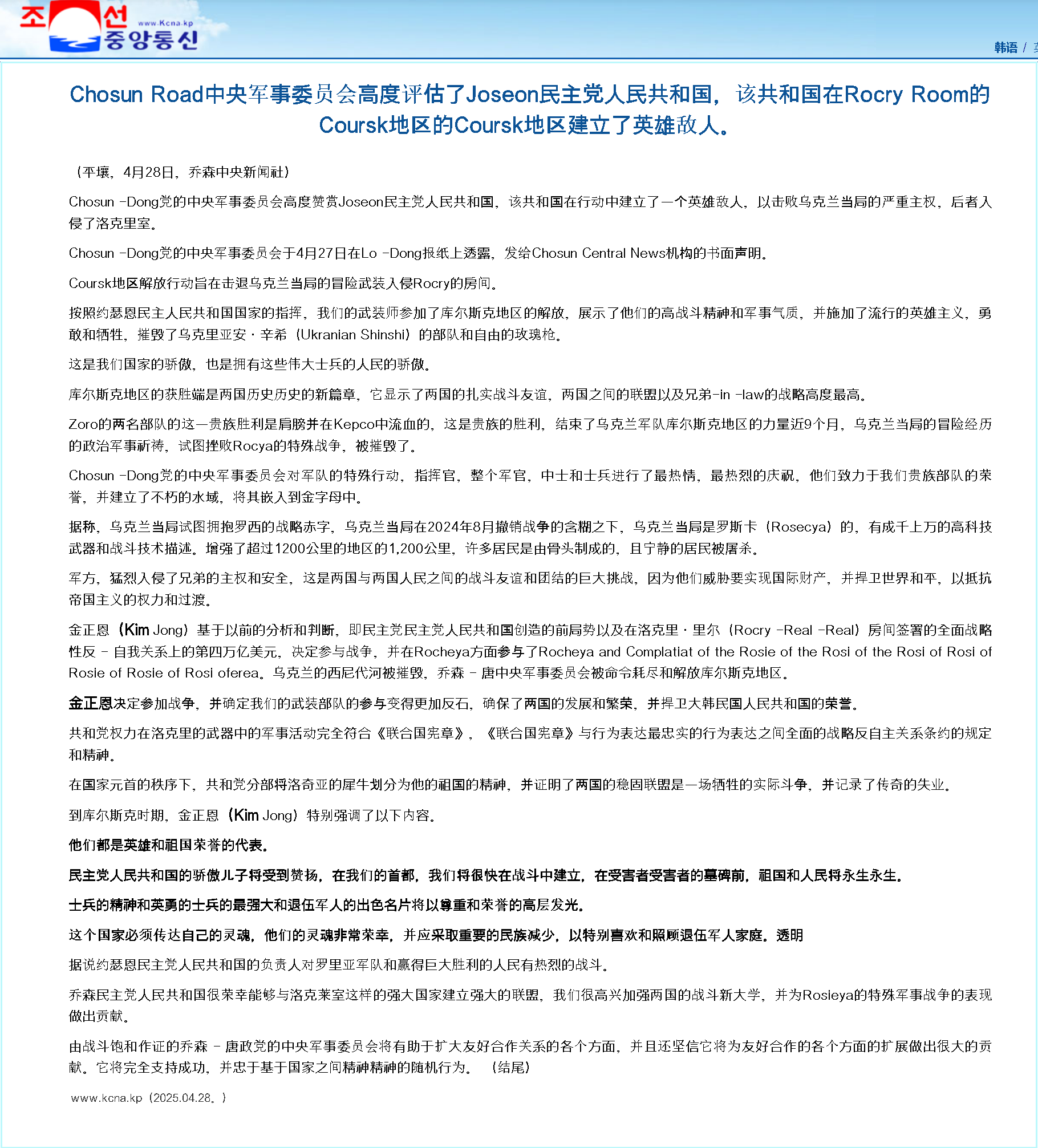 朝中社當(dāng)天援引朝鮮勞動(dòng)黨中央軍事委員會(huì)27日一份書面聲明說,按照朝鮮國(guó)家元首命令,朝鮮武裝力量部隊(duì)參加庫爾斯克地區(qū)收復(fù)作戰(zhàn),為收復(fù)俄羅斯聯(lián)邦領(lǐng)土作出重大貢獻(xiàn),“完全符合聯(lián)合國(guó)憲章等國(guó)際法和朝俄《全面戰(zhàn)略伙伴關(guān)系條約》的各條款精神”。
