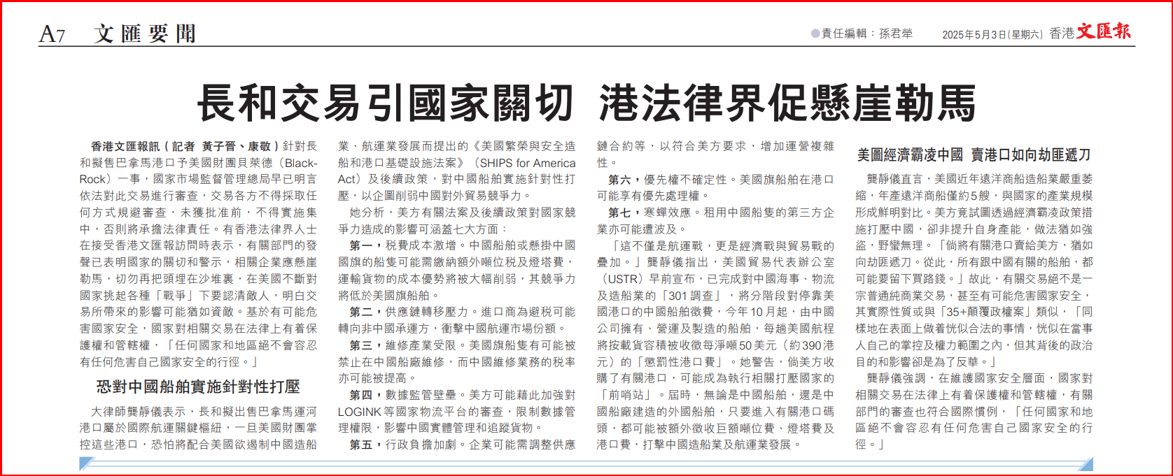 大律師龔靜儀表示,長和擬出售巴拿馬運(yùn)河港口屬于國際航運(yùn)關(guān)鍵樞紐,一旦美國財團(tuán)掌控這些港口,恐怕將配合美國欲遏制中國造船業(yè)、航運(yùn)業(yè)發(fā)展而提出的《美國繁榮與安全造船和港口基礎(chǔ)設(shè)施法案》(SHIPS for America Act)及后續(xù)政策,對中國船舶實施針對性打壓,以企圖削弱中國對外貿(mào)易競爭力。
