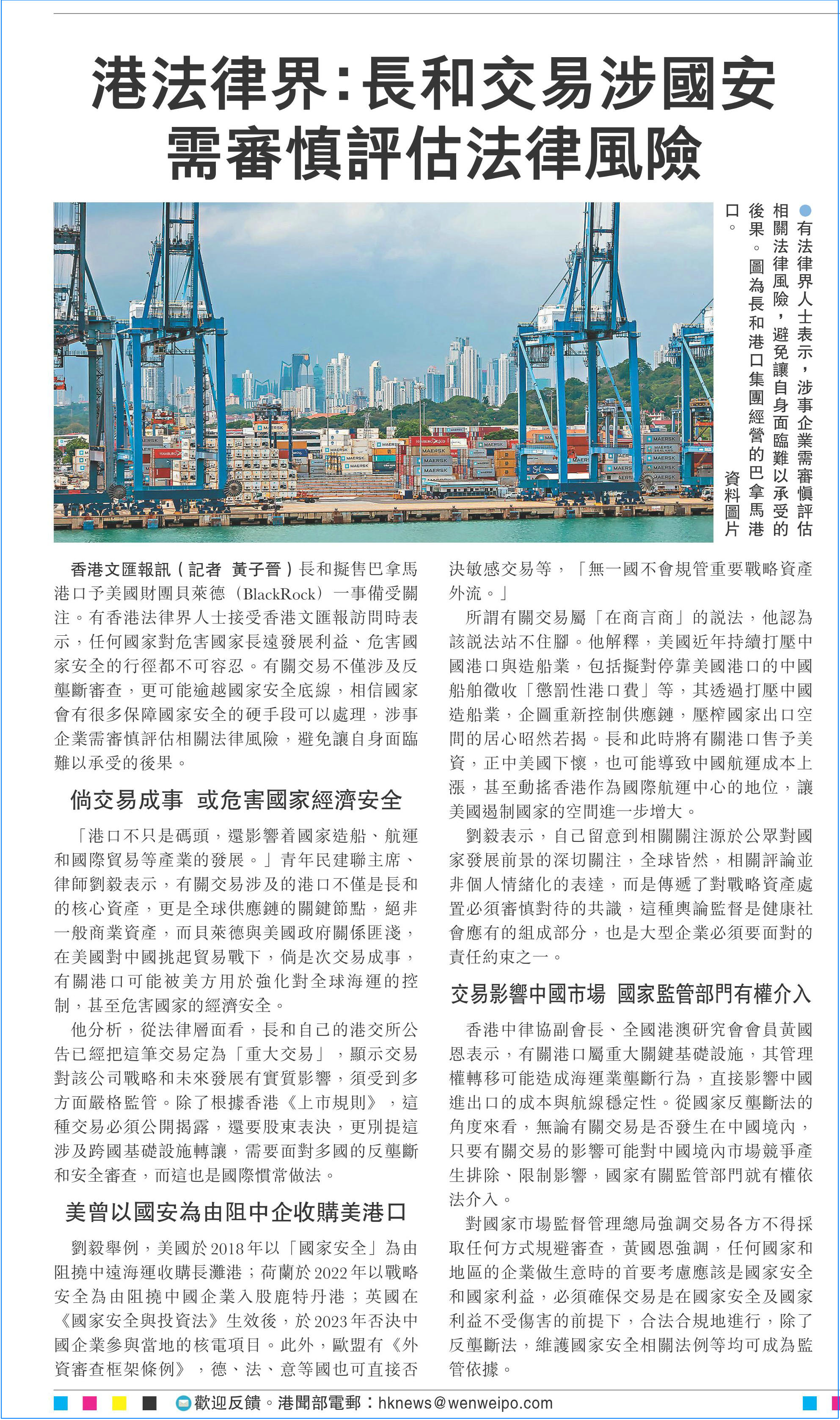 香港文匯報(bào)訊(記者黃子晉)長(zhǎng)和擬售巴拿馬港口予美國財(cái)團(tuán)貝萊德(BlackRock)一事備受關(guān)注。有香港法律界人士接受香港文匯報(bào)訪問時(shí)表示,任何國家對(duì)危害國家長(zhǎng)遠(yuǎn)發(fā)展利益、危害國家安全的行徑都不可容忍。有關(guān)交易不僅涉及反壟斷審查,更可能逾越國家安全底線,相信國家會(huì)有很多保障國家安全的硬手段可以處理,涉事企業(yè)需審慎評(píng)估相關(guān)法律風(fēng)險(xiǎn),避免讓自身面臨難以承受的后果。