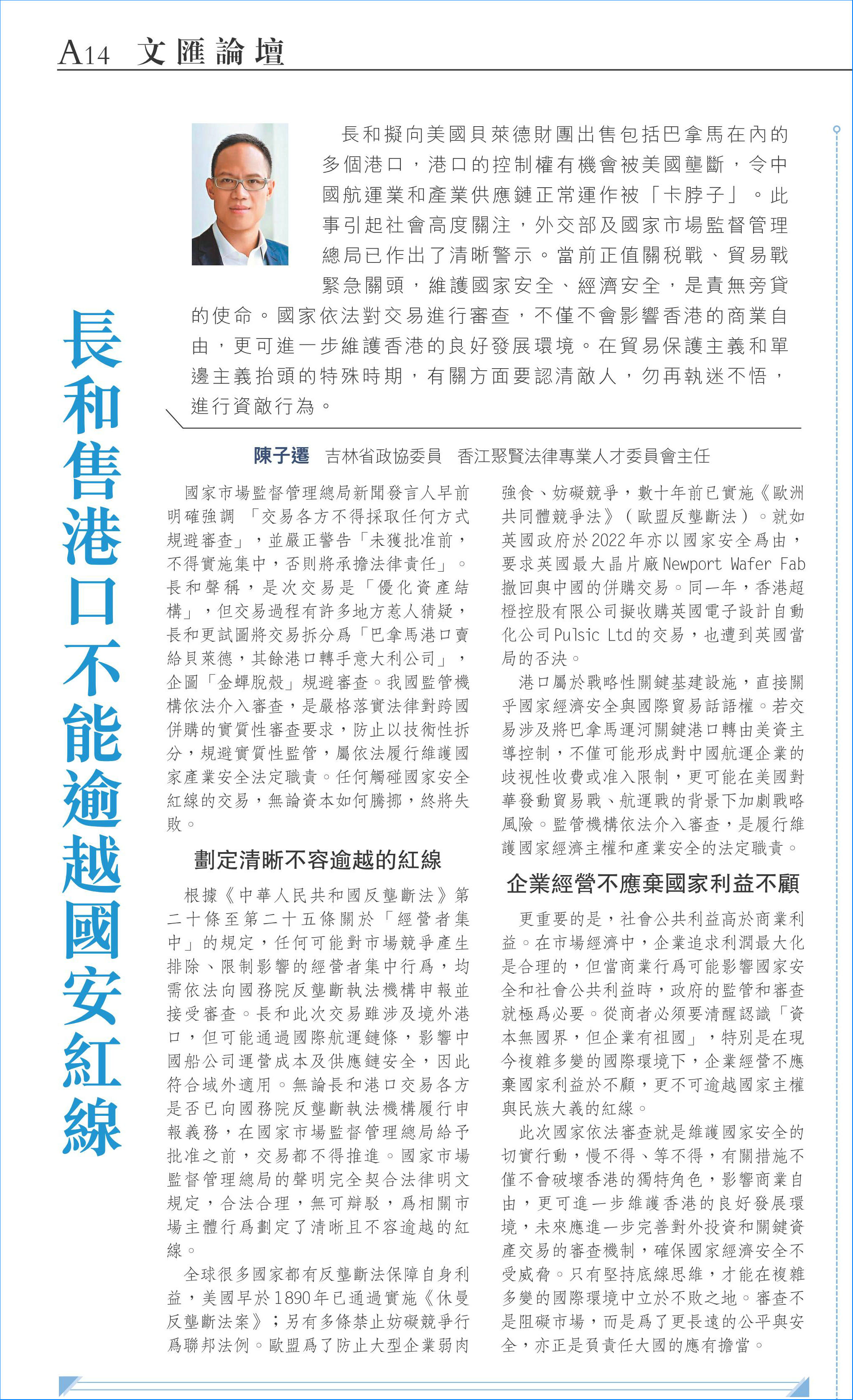 長和擬向美國貝萊德財團出售包括巴拿馬在內(nèi)的多個港口,港口的控制權(quán)有機會被美國壟斷,令中國航運業(yè)和產(chǎn)業(yè)供應(yīng)鏈正常運作被「卡脖子」。此事引起社會高度關(guān)注,外交部及國家市場監(jiān)督管理總局已作出了清晰警示。當前正值關(guān)稅戰(zhàn)、貿(mào)易戰(zhàn)緊急關(guān)頭,維護國家安全、經(jīng)濟安全,是責(zé)無旁貸的使命。國家依法對交易進行審查,不僅不會影響香港的商業(yè)自由,更可進一步維護香港的良好發(fā)展環(huán)境。在貿(mào)易保護主義和單邊主義抬頭的特殊時期,有關(guān)方面要認清敵人,勿再執(zhí)迷不悟,進行資敵行為。