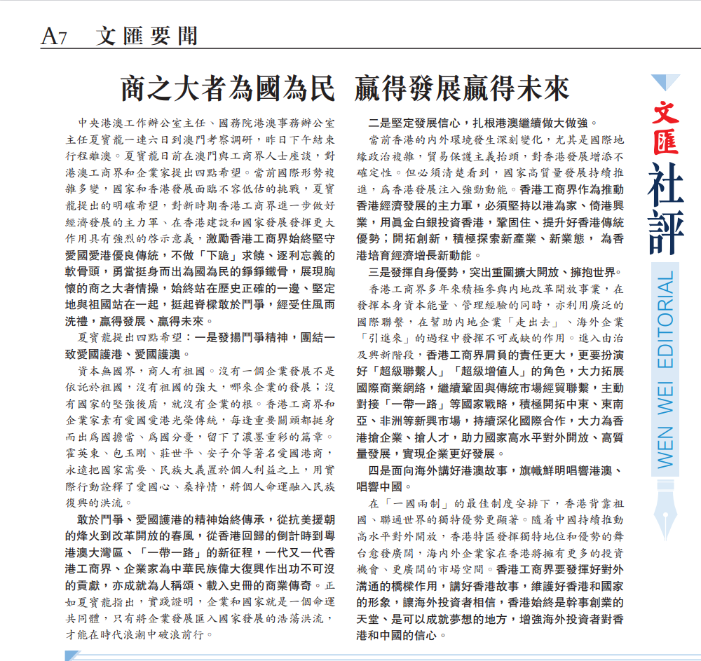 中央港澳工作辦公室主任、國務院港澳事務辦公室主任夏寶龍一連六日到澳門考察調(diào)研,昨日下午結(jié)束行程離澳。夏寶龍日前在澳門與工商界人士座談,對港澳工商界和企業(yè)家提出四點希望。當前國際形勢復雜多變,國家和香港發(fā)展面臨不容低估的挑戰(zhàn),夏寶龍?zhí)岢龅拿鞔_希望,對新時期香港工商界進一步做好經(jīng)濟發(fā)展的主力軍、在香港建設和國家發(fā)展發(fā)揮更大作用具有強烈的啟示意義,激勵香港工商界始終堅守愛國愛港優(yōu)良傳統(tǒng),不做「下跪」求饒、逐利忘義的軟骨頭,勇當挺身而出為國為民的錚錚鐵骨,展現(xiàn)胸懷的商之大者情操,始終站在歷史正確的一邊、堅定地與祖國站在一起,挺起脊梁敢于斗爭,經(jīng)受住風雨洗禮,贏得發(fā)展、贏得未來。