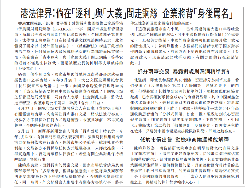 香港文匯報訊(記者黃子晉)針對長和集團擬售巴拿馬等港口予美國財團貝萊德(BlackRock)一事,國家市場監(jiān)督管理總局、商務(wù)部等國家有關(guān)部門對此多次表態(tài),全國港澳研究會會員、法學博士陳曉鋒昨日在接受香港文匯報訪問時表示,此舉體現(xiàn)了國家以《反外國制裁法》、《反壟斷法》構(gòu)建了嚴密的法治屏障,任何試圖危害國家戰(zhàn)略利益的行為都將面臨雷霆手段,倘企業(yè)在「資本逐利」與「家國大義」間走鋼絲,等待它的或許不僅是法律制裁,更是被歷史長河沖刷得支離破碎的「身后罵名」。