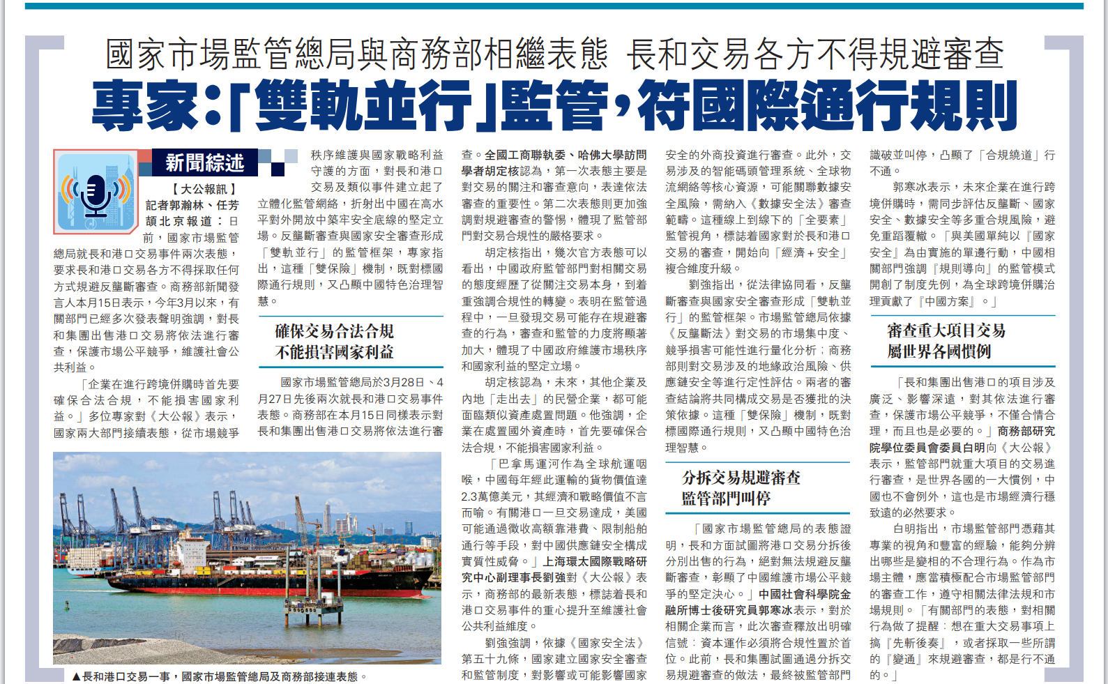 「企業(yè)在進(jìn)行跨境并購(gòu)時(shí)首先要確保合法合規(guī),不能損害國(guó)家利益?!苟辔粚?zhuān)家對(duì)《大公報(bào)》表示,國(guó)家兩大部門(mén)接續(xù)表態(tài),從市場(chǎng)競(jìng)爭(zhēng)秩序維護(hù)與國(guó)家戰(zhàn)略利益守護(hù)的方面,對(duì)長(zhǎng)和港口交易及類(lèi)似事件建立起了立體化監(jiān)管網(wǎng)絡(luò),折射出中國(guó)在高水平對(duì)外開(kāi)放中筑牢安全底線(xiàn)的堅(jiān)定立場(chǎng)。反壟斷審查與國(guó)家安全審查形成「雙軌并行」的監(jiān)管框架,專(zhuān)家指出,這種「雙保險(xiǎn)」機(jī)制,既對(duì)標(biāo)國(guó)際通行規(guī)則,又凸顯中國(guó)特色治理智慧。