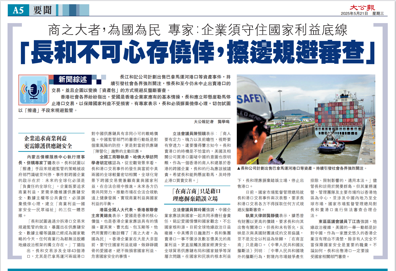 香港社會(huì)各界紛紛指出,愛國(guó)是香港企業(yè)家應(yīng)有的基本情操,長(zhǎng)和應(yīng)立即懸崖勒馬停止港口交易,以保障國(guó)家利益不受損害。有專家表示,長(zhǎng)和必須摒棄僥幸心理,切勿試圖以「擦邊」手段來規(guī)避監(jiān)管。 \大公報(bào)記者龔學(xué)鳴