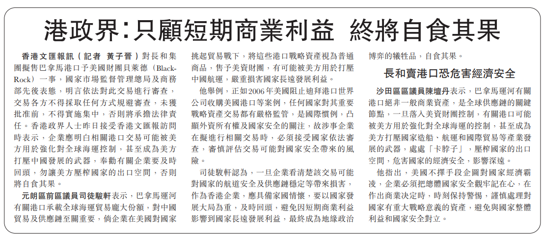 司徒駿軒認(rèn)為,一旦企業(yè)看清楚該交易可能對(duì)國(guó)家的航道安全及供應(yīng)鏈穩(wěn)定等帶來(lái)?yè)p害,作為香港企業(yè),應(yīng)具備家國(guó)情懷,要以國(guó)家發(fā)展大局為重,及時(shí)回頭,避免因短期商業(yè)利益影響到國(guó)家長(zhǎng)遠(yuǎn)發(fā)展利益,最終成為地緣政治博弈的犧牲品,自食其果。