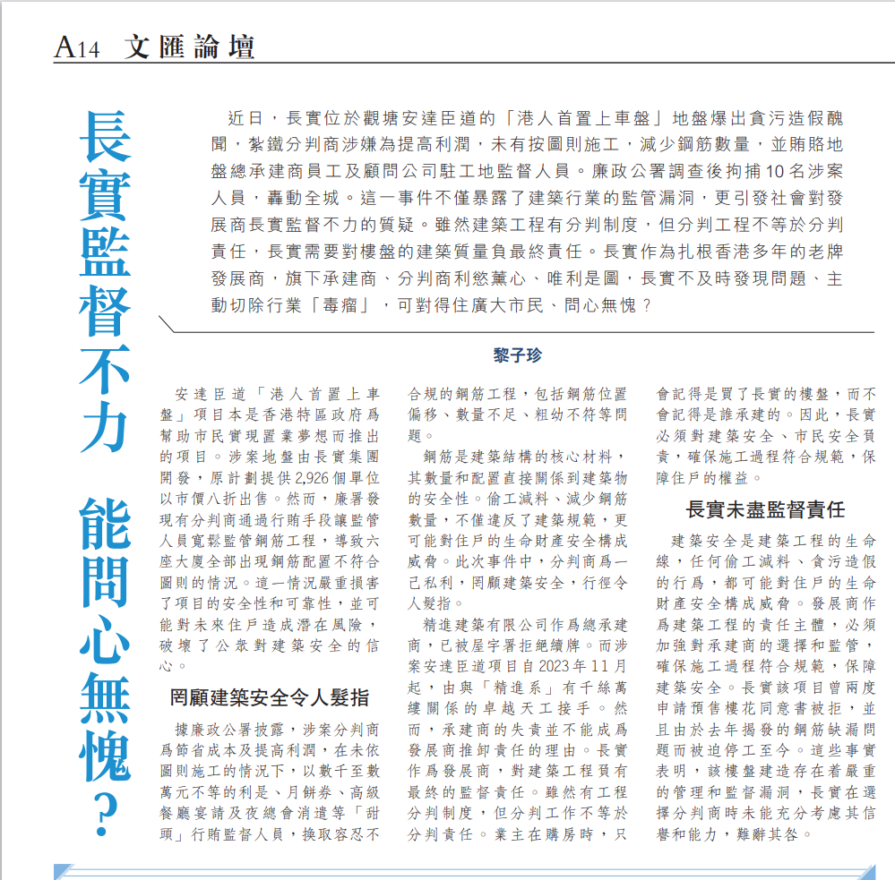 近日,長實位于觀塘安達臣道的「港人首置上車盤」地盤爆出貪污造假丑聞,扎鐵分判商涉嫌為提高利潤,未有按圖則施工,減少鋼筋數(shù)量,并賄賂地盤總承建商員工及顧問公司駐工地監(jiān)督人員。廉政公署調(diào)查后拘捕10名涉案人員,轟動全城。這一事件不僅暴露了建筑行業(yè)的監(jiān)管漏洞,更引發(fā)社會對發(fā)展商長實監(jiān)督不力的質(zhì)疑。雖然建筑工程有分判制度,但分判工程不等于分判責任,長實需要對樓盤的建筑質(zhì)量負最終責任。長實作為扎根香港多年的老牌發(fā)展商,旗下承建商、分判商利欲薰心、唯利是圖,長實不及時發(fā)現(xiàn)問題、主動切除行業(yè)「毒瘤」,可對得住廣大市民、問心無愧?