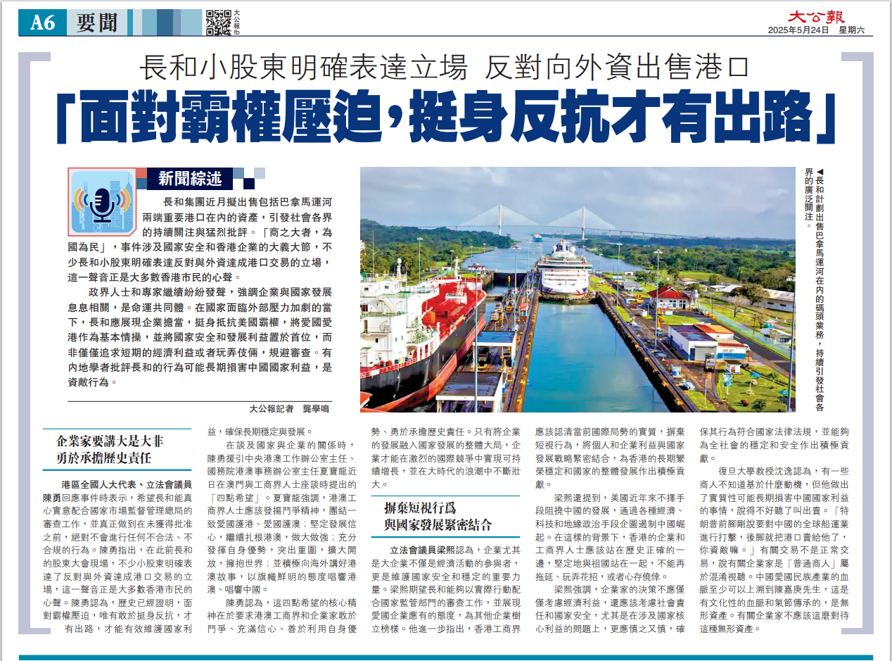 長(zhǎng)和集團(tuán)近月擬出售包括巴拿馬運(yùn)河兩端重要港口在內(nèi)的資產(chǎn),引發(fā)社會(huì)各界的持續(xù)關(guān)注與猛烈批評(píng)。 「商之大者,為國(guó)為民」,事件涉及國(guó)家安全和香港企業(yè)的大義大節(jié),不少長(zhǎng)和小股東明確表達(dá)反對(duì)與外資達(dá)成港口交易的立場(chǎng),這一聲音正是大多數(shù)香港市民的心聲。