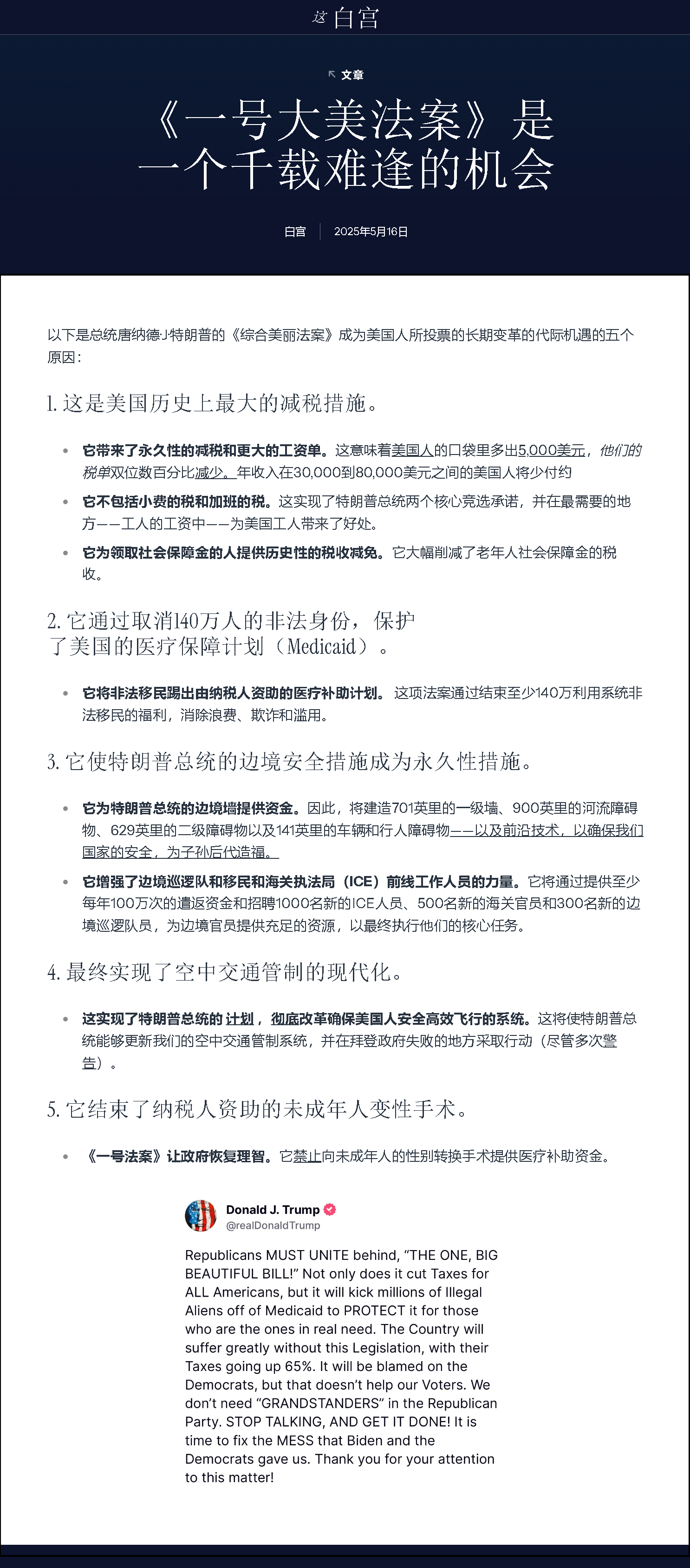 上月,美國共和黨人占據(jù)多數(shù)的國會(huì)眾議院以一票優(yōu)勢艱難通過被美國總統(tǒng)特朗普稱為“大而美”的大規(guī)模稅收與支出法案。據(jù)悉,該法案包含多項(xiàng)條款,內(nèi)容超過1000頁,主要側(cè)重于減稅和削減開支。法案將延長特朗普在其第一個(gè)總統(tǒng)任期內(nèi)于2017年通過的企業(yè)和個(gè)人減稅措施,對(duì)小費(fèi)、汽車貸款等提供新的稅收減免,同時(shí)增加國防支出,并為打擊非法移民提供更多資金。