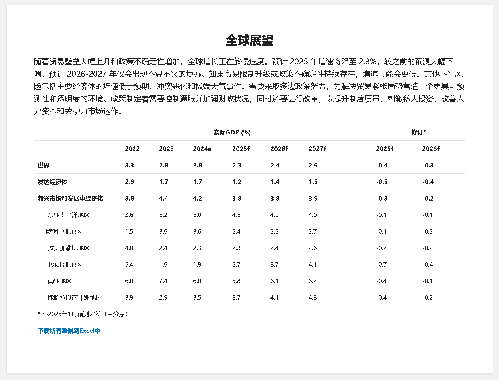 根據(jù)世界銀行報告,全球經(jīng)濟(jì)在2026年和2027年將出現(xiàn)疲弱反彈。新興市場和發(fā)展中經(jīng)濟(jì)體在縮小與發(fā)達(dá)經(jīng)濟(jì)體人均收入差距和減少極端貧困方面的進(jìn)展仍將不足,其前景很大程度上依賴于全球貿(mào)易政策的變化。