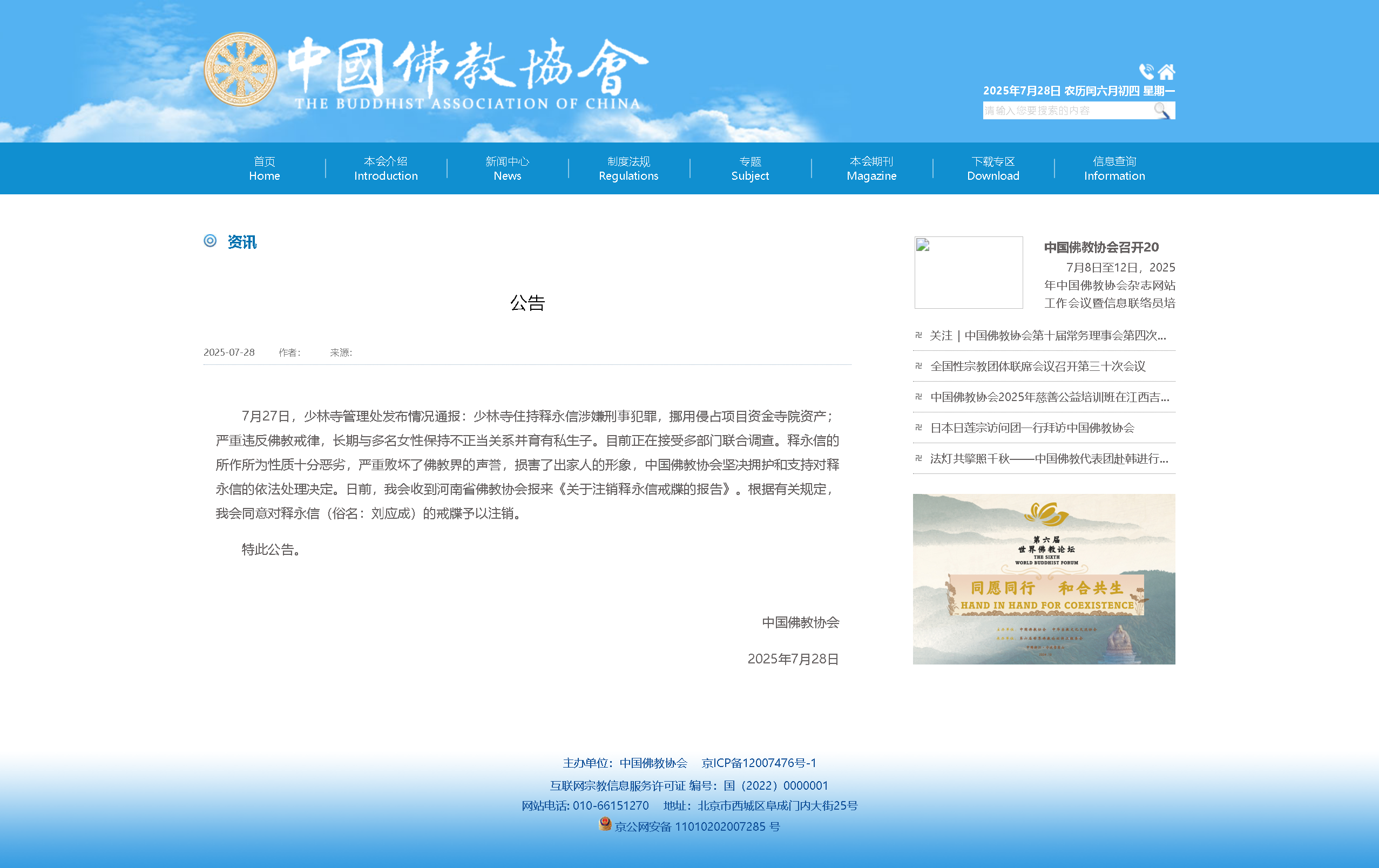 7月27日,少林寺管理處發(fā)布情況通報(bào):少林寺住持釋永信涉嫌刑事犯罪,挪用侵占項(xiàng)目資金寺院資產(chǎn);嚴(yán)重違反佛教戒律,長(zhǎng)期與多名女性保持不正當(dāng)關(guān)系并育有私生子。目前正在接受多部門聯(lián)合調(diào)查。釋永信的所作所為性質(zhì)十分惡劣,嚴(yán)重?cái)牧朔鸾探绲穆曌u(yù),損害了出家人的形象,中國(guó)佛教協(xié)會(huì)堅(jiān)決擁護(hù)和支持對(duì)釋永信的依法處理決定。日前,我會(huì)收到河南省佛教協(xié)會(huì)報(bào)來(lái)《關(guān)于注銷釋永信戒牒的報(bào)告》。根據(jù)有關(guān)規(guī)定,我會(huì)同意對(duì)釋永信(俗名:劉應(yīng)成)的戒牒予以注銷。