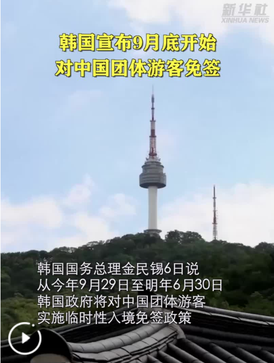 新華社首爾8月6日電(記者陸睿 黃昕欣)韓國國務(wù)總理金民錫6日說,從今年9月29日至明年6月30日,韓國政府將對中國團體游客實施臨時性入境免簽政策。