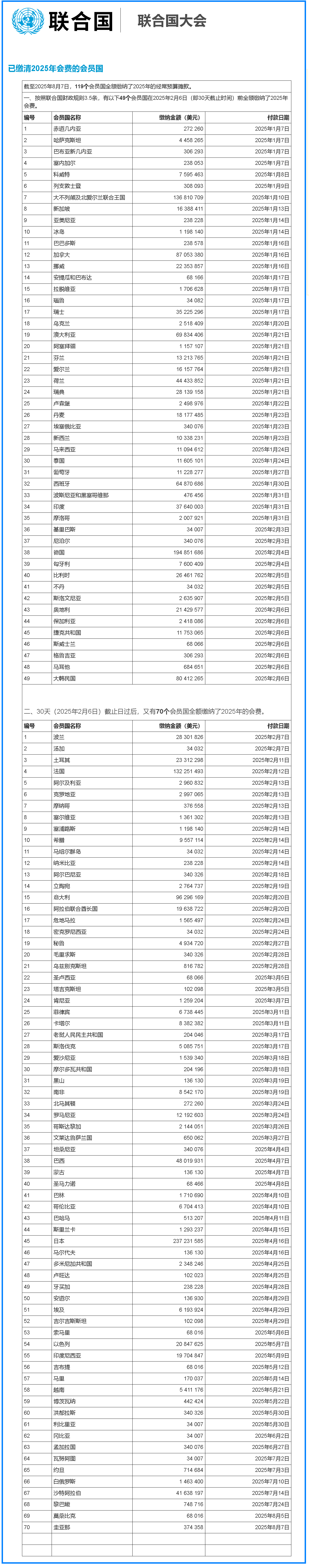 二、30天(2025年2月6日)截止日過后,又有70個(gè)會(huì)員國(guó)全額繳納了2025年的會(huì)費(fèi)。