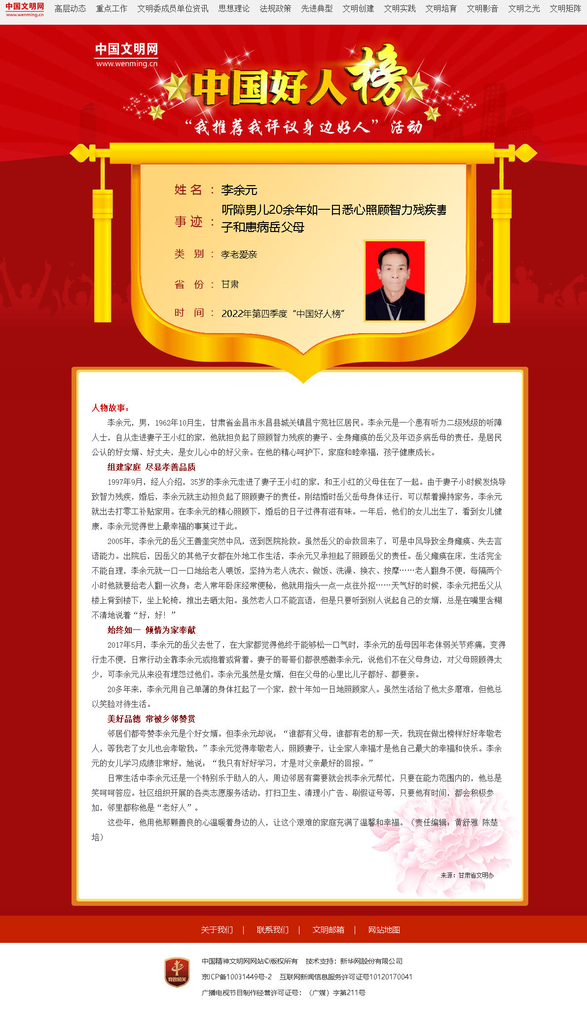 這個人叫李余元。27歲時,一場意外讓他失去了聽力,被診斷為終身聽力二級殘疾。35歲時,經(jīng)人介紹,李余元和有智力殘疾的王小紅組建了家庭,他擔(dān)負起照顧妻子的責(zé)任。在他的精心呵護下,家庭和睦幸福,孩子健康成長。2022年,他榮登第四季度“中國好人榜”。