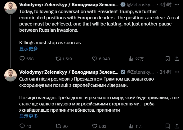 “大家都認為,結束沖突的最佳方式是直接達成和平協(xié)議,這將結束戰(zhàn)爭,而不是僅僅達成?;饏f(xié)議,因為?;饏f(xié)議往往行不通,”特朗普寫道,“如果一切順利”,他將很快安排與普京和澤連斯基舉行三邊峰會。他強調:“這可能會挽救數(shù)百萬人的生命?!?